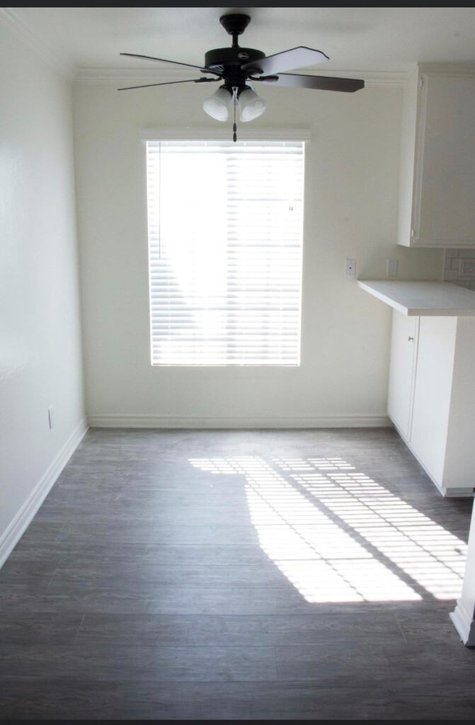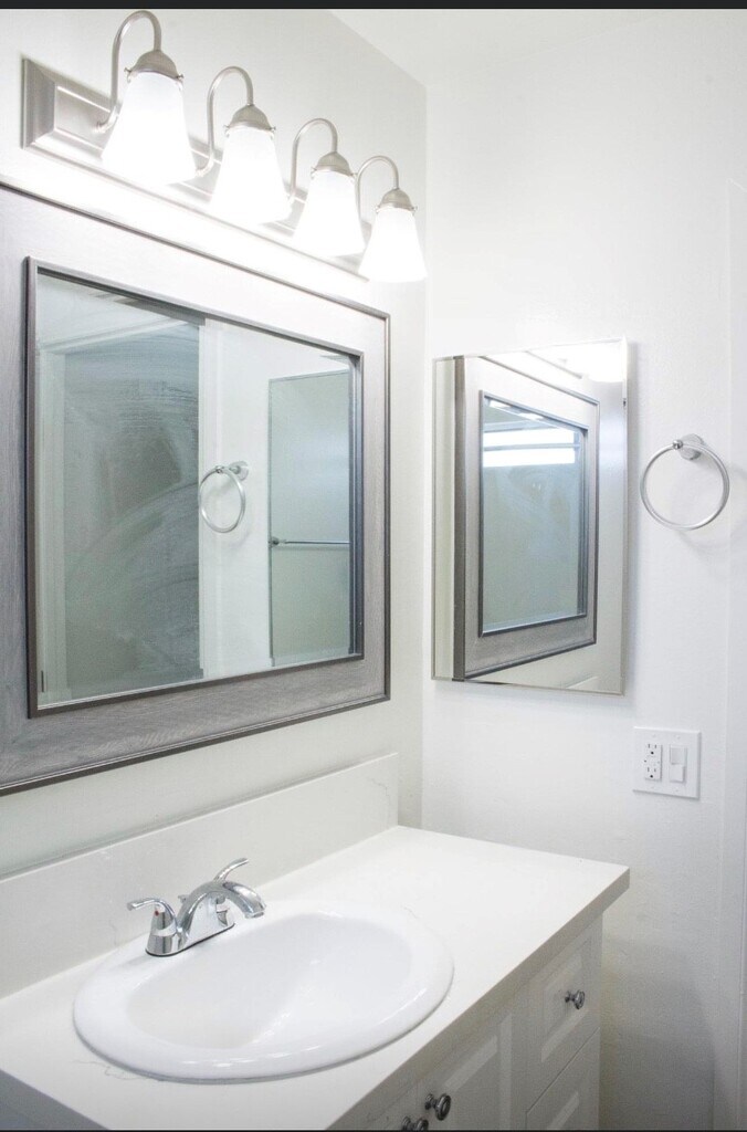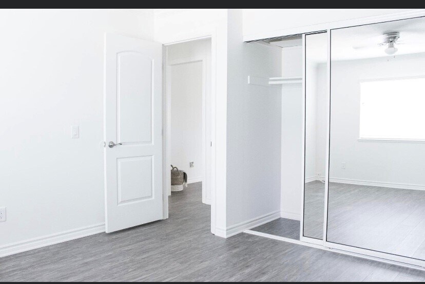 One bedroom with beautiful laminated flooring and remodeled bathroom.
