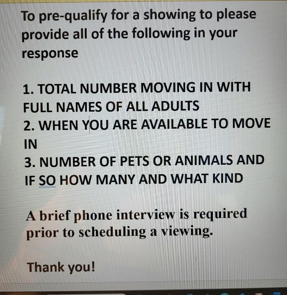 PLEASE READ THE AD BEFORE RESPONDING~~PLEASE READ THE AD BEFORE RESPONDING To pre-qualify for a showing to please provide all of the following in your response: 1. TOTAL NUMBER MOVING IN WITH FULL NAMES OF ALL ADULTS 2. WHEN YOU ARE AVAILABLE TO MOVE IN 3. PLEASE PROVIDE A CONTACT PHONE NUMBER. A brief phone interview is required prior to scheduling a viewing. Thank you!