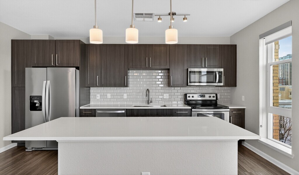 Discover modern downtown Denver apartments and Townhomes at 20th Street Station. Your time matters, so we skip the hidden fee shuffle. Our prices include required monthly costs, no extra math, no mystery, just the real number. Homes feature gorgeous grey wash cabinetry, quartz countertops, tile backsplash, and wood style flooring. Your fitness center includes a rock wall, TRX bands, and dedicated yoga and spin rooms to help you stay moving. Your new social spaces include our incredible 5th floor pool and hot tub, with accompanying hangout areas by our firepits and built in barbeques as well as co working spaces and private work pods. You ll live in the heart of downtown Denver where you can walk and bike with ease. You ll be less than a mile from Coors Field, Union Station and the Denver Performing Arts Center and just blocks from the Light Rail, LoDo, LoHi, and RiNo.