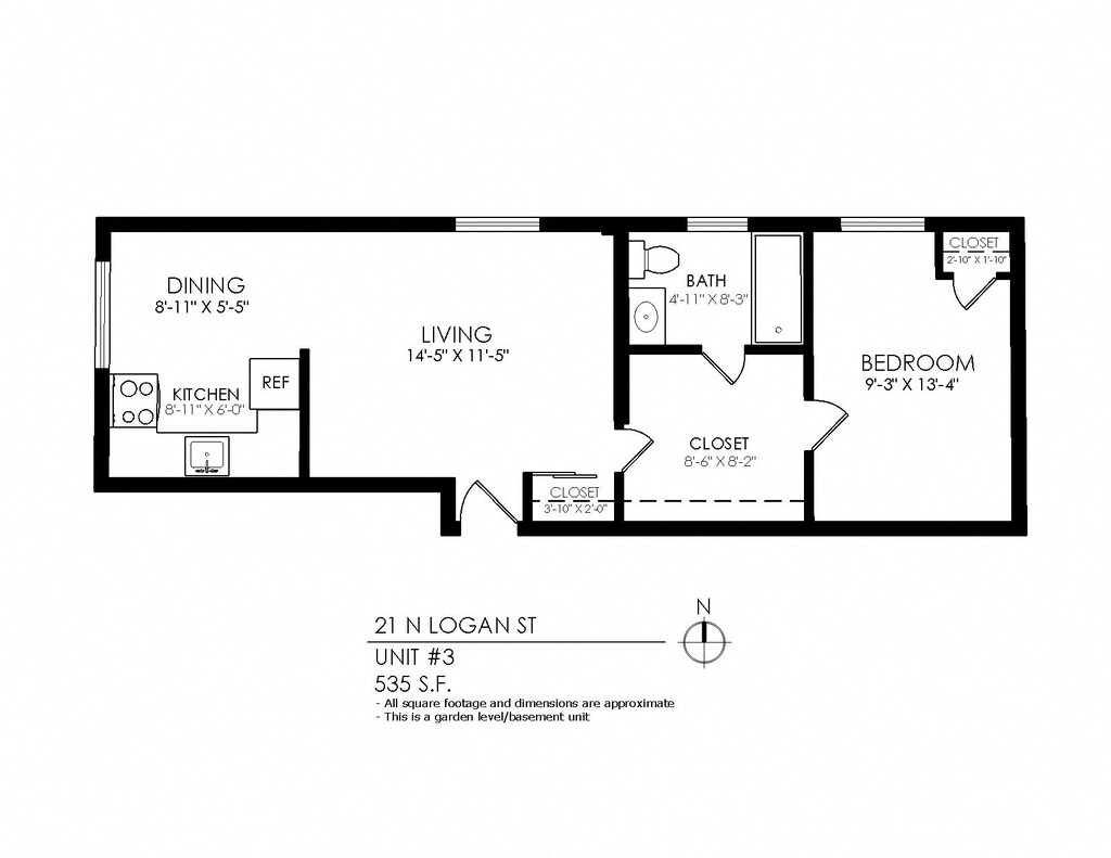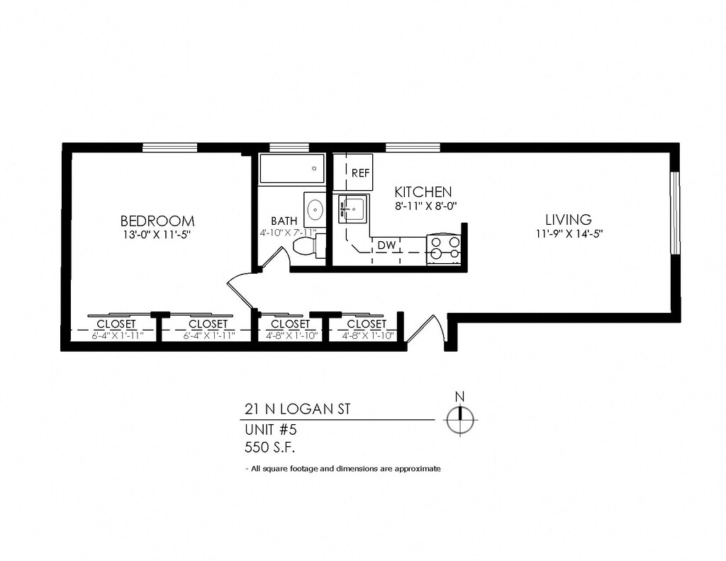 21 Logan Studio - Floorplan 1 Apartment Unit: 04Apartment Model: 21 Logan StudioStudio, 1 Bath, 410 sq ftAvailable Now1 Bedroom