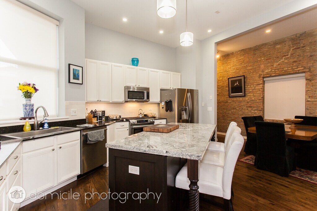 This roomy, three bedroom, two-bathroom condo is ready for new renters starting Sept. 1! The unit features exposed brick, hardwood floors in the common areas, in-unit laundry and two private outdoor spaces! Each bedroom will hold at least a queen bed, with the carpeted primary suite comes with a walk-in closet, a private patio and an en-suite bathroom with a double vanity! The remaining two bedrooms are roomy, carpeted and large enough to serve as either bedrooms, guest rooms or a home office! Meanwhile, the updated kitchen comes with a center island, ample cabinet space, stone counters and stainless steel appliances. It opens to a living area perfect for entertaining. There's also in-unit laundry, central AC, and a second deck in the back of the building. One secured, outdoor parking spot is included. The unit is centrally located near I-290, the United Center, medical district and the Green/Blue line.