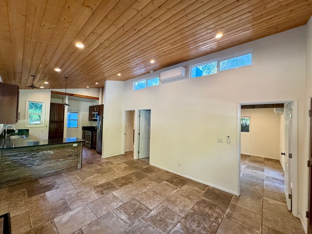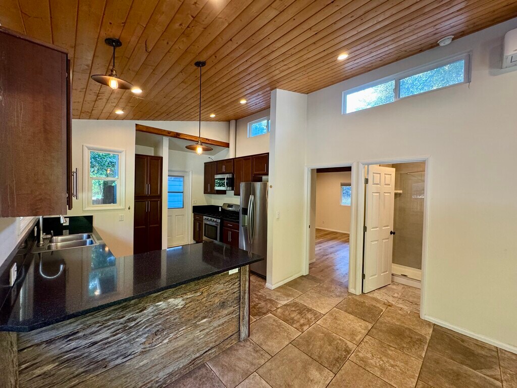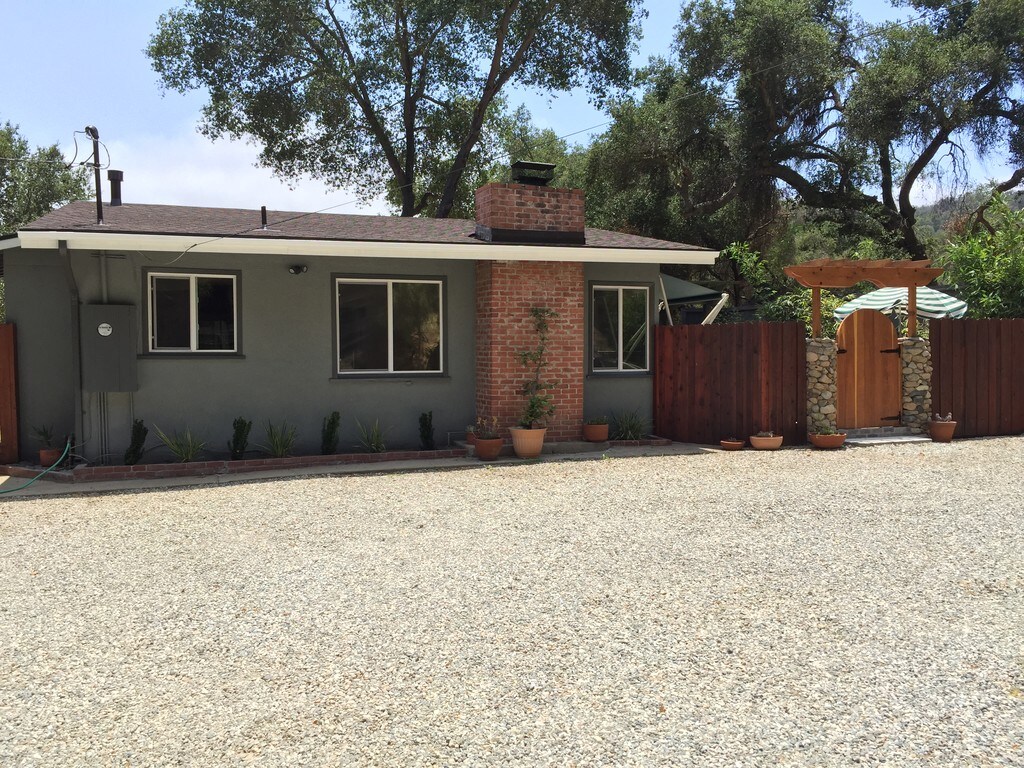 Stylish Newly Re-Modeled Topanga Cyn Single Family Home. 2 bedroom/2 bath inclusive of an additional detached studio that can serve as an office or bedroom as well. Quiet, peaceful right next door to state parkland, perfect for hiking right out your back door! Located right off Topanga Canyon Blvd, .2 miles from the center of town -- Very Walkable. The property also contains all new Stainless Steel appliances, a Rain Shower, Restoration Hardware fixtures, AC/Heat in each bedroom, Washer/Dryer, Tongue & Groove Wood ceiling, French Doors, an 800 sq. foot patio, a fireplace & Salvaged Barnyard wood as accents. Enough flat parking to fit 8 cars, an electric gate for entry, a backyard that neighbors & immediately opens up to Topanga Park & access to trails right outside your back door.