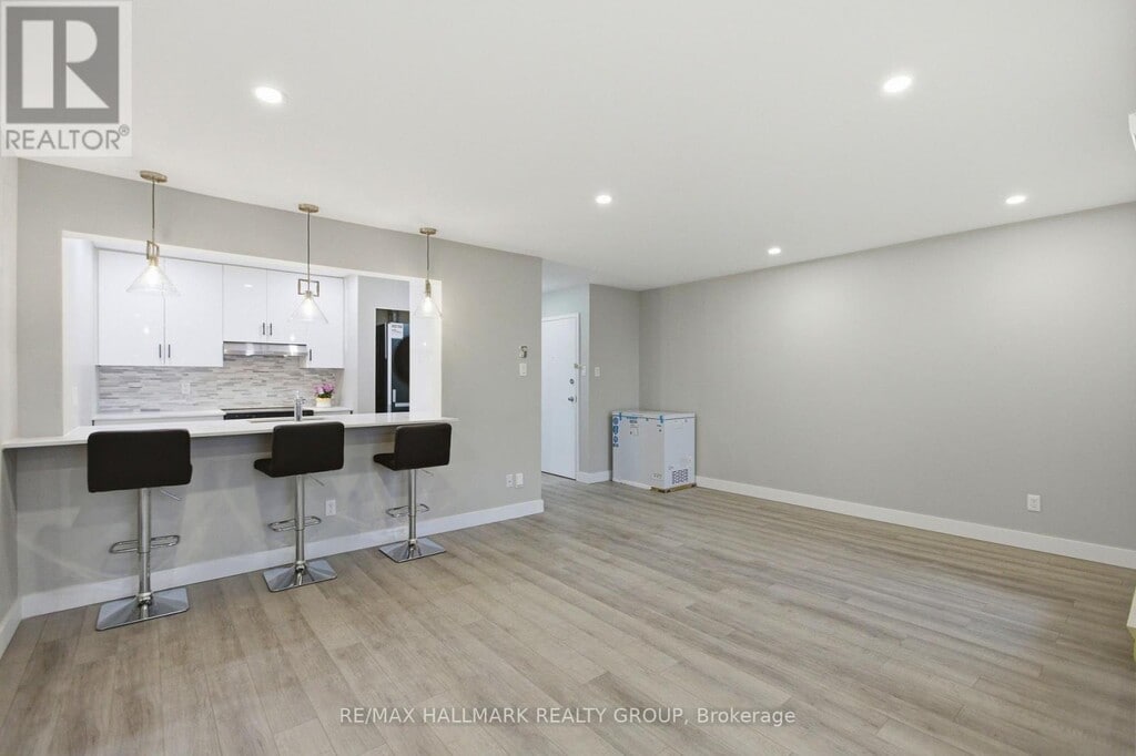 Beautifully renovated top-to-bottom! This stunning 2-bedroom condo features a custom quartz kitchen with a peninsula breakfast bar that flows into an open-concept living and dining area-perfect for entertaining. The space is accented by a modern electric fireplace and sleek pot lights throughout. Enjoy premium luxury vinyl flooring,a contemporary bathroom,and the convenience of in-suite laundry. Step out onto your large private balcony to unwind. Includes assigned parking and ample storage. Ideally located steps from shopping,transit,and the prestigious Merivale HS (IB Program). Immediate occupancy available. (No pets/no smoking per condo regulations). A must-see for professionals and downsizers seeking refined,turn-key living! (id:52069) ID#: 1959826