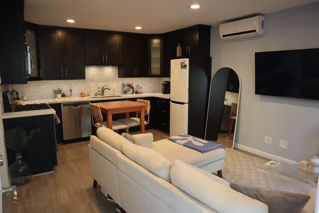 This 1-bedroom, 1-bathroom apartment located at 219 42nd St offers beach living. The living room features ample natural light and connects directly to a private deck. The kitchen is equipped with stainless steel appliances, including a dishwasher, oven, and refrigerator, providing modern conveniences for daily living. The bathroom includes standard fixtures and is designed for functionality. Additional amenities include in-unit washer and dryer, air conditioning, and a smoke-free environment. The exterior features a deck, perfect for outdoor relaxation. This property is ideal for individuals seeking a compact and efficient living space in close proximity to beach and LAX.