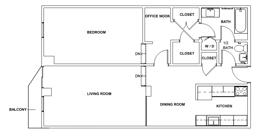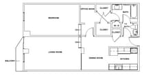 E04 - Floorplan Apartment Unit: 502Apartment Model: E04$2,6501 Bedroom, 1 Bath, 622 sq ftAvailable July 1, 2026Floorplan 102