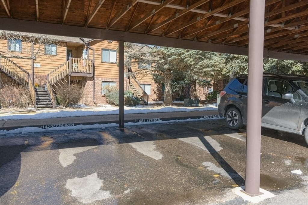 Spacious and stylish main-level 1-bedroom condo with a covered carport (#34). Fully remodeled and move-in ready. The kitchen features sleek quartz countertops, a farmhouse-style undermount sink, and custom rustic shelves. Hardwood flooring flows throughout the open layout into the living area. The bathroom has modern tile finishes, and the large walk-in closet plus additional storage offer plenty of space. Enjoy your north-facing patio for morning coffee or evening relaxation. Private outdoor storage is included, and main-level entry provides easy access. Community perks: pool, clubhouse, and beautifully maintained grounds. HOA dues (included in rent) cover water, sewer, trash, and snow removal. Close to trails, open space, shopping, and dining this condo combines comfort, convenience, and style. Available Now!