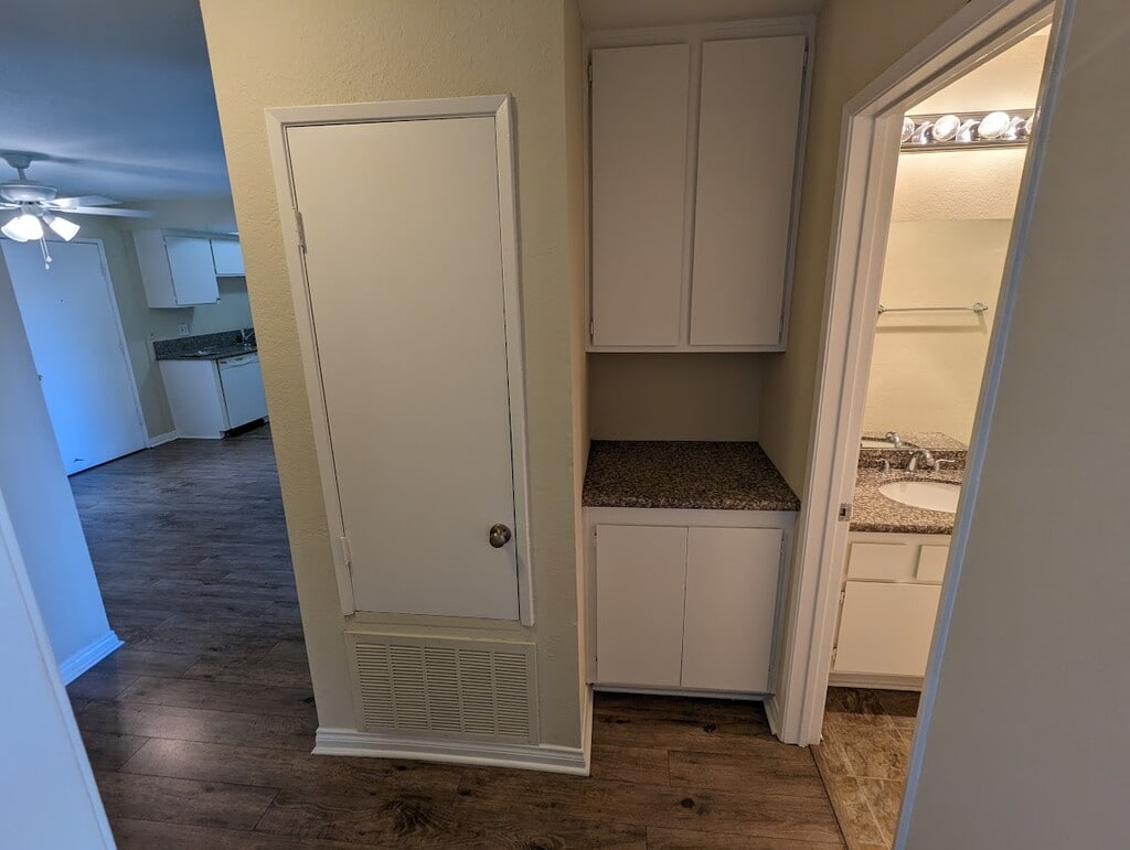 #206 is a 2-bedroom, 2-bathroom apartment with central air and a patio! Laminate plank flooring in the living and dining area, carpet in the bedrooms, and vinyl flooring in the kitchen and bathrooms. Stove, oven, microwave, and dishwasher included! Extra storage in the hallway with an adorable countertop matching the bathroom and kitchen. 2 FULL bathrooms!