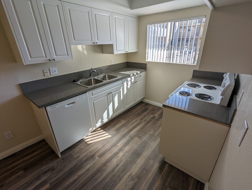 Unit 212 is in the front of the building with a balcony with a great view of tree-lined Verdugo Ave. 2 bedrooms, 2 full bathrooms! Laminate (looks like hardwood) throughout with vinyl flooring in the kitchen and bathrooms. The beautiful balcony with view off of the living room. The full kitchen with granite countertops includes the electric range, electric oven, microwave, and dishwasher! Full bathroom in the hallway and a full bathroom en suite!