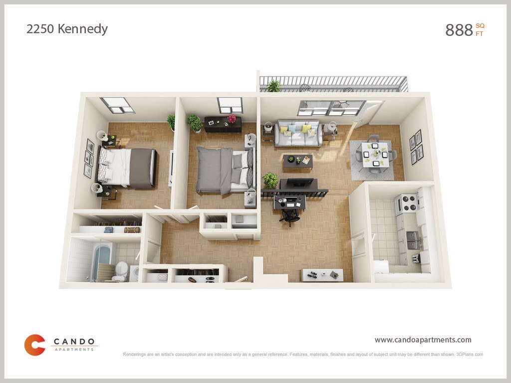 2 Beds, 1 Bath, 888 sq ftAvailable NowModel Gallery