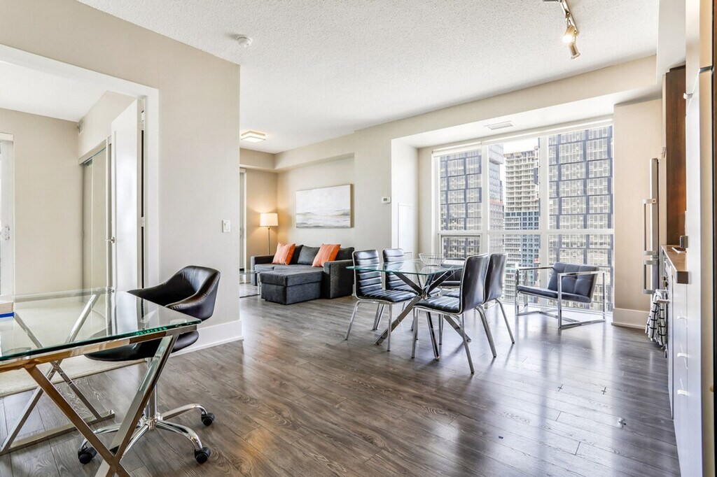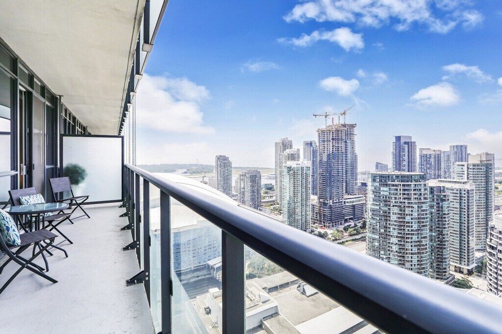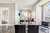 Experience the charm of living in the iconic 300 Front St W with this spacious 2-bedroom, 2-bathroom apartment. Situated on a high floor, this apartment offers stunning views from the balcony, making it easy to feel at home. The apartment features a fully equipped kitchen and in-unit laundry for your convenience. The apartment is designed with modern living in mind, offering a smart TV and super high-speed internet to keep you connected and entertained. Each bedroom is furnished with a comfortable queen bed, ensuring a restful night's sleep. Located in a vibrant neighborhood, you'll find all amenities at your doorstep, including a Starbucks and South Street Burger right at the condo. This prime location offers easy access to the best the city has to offer. The apartment includes a workspace with a desk and chair, perfect for those who need a dedicated area to work from home.