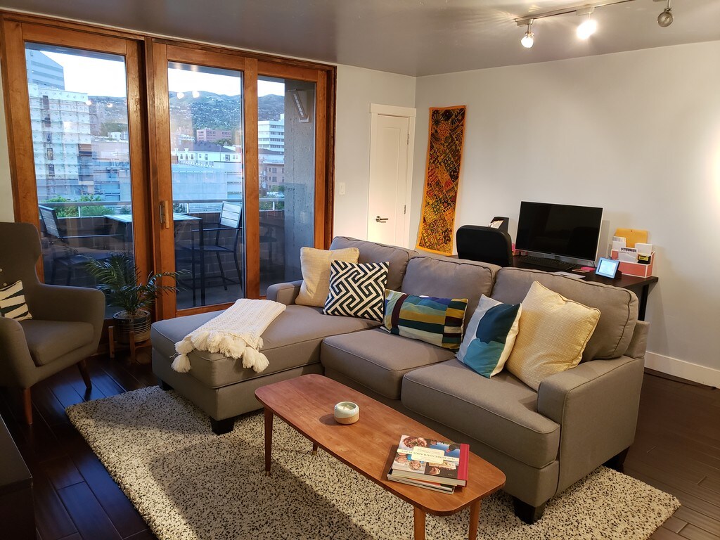 Downtown location and convenience! Well-appointed 1 BR / 1 BA apartment in the sought-after Broadway Towers building in the downtown Broadway Arts District. Fully remodeled with granite counter tops, stainless steel appliances, hardwood floors, soaking tub and ample storage space. Private balcony overlooks city and mountain views. Park your car in the secured garage and walk to dozens of restaurants and shops, catch a concert in Gallivan Plaza or a yoga or spin class down the street. The city is at your doorstep! AVAILABLE FOR LEASE BEGINNING JULY 1, 2021 Apartment features: - 720 sq ft., 1 bedroom, 1 bath with generous closet and pantry space - Large kitchen with granite counter tops, stainless steel appliances and ample storage - In-unit washer / dryer - Assigned parking space (1) in fully enclosed and secured garage - Patio with mountain and city views - Central heating and air conditioning - Wired for G. Fiber, Comcast - Building amenities include: Gym / fitness center, Sauna, outdoor hot tub, secured building access and mail delivery - Amenities within 1 block include: Coffee shop, yoga studio, Torrent Cycle, dry cleaner, nail salon, restaurants, boutiques, state store Lease terms: - Rent: $1490 / month, includes 1 parking space (assigned), water, trash, basic cable. Tenant pays electricity - 12+ month lease, longer lease terms available - First month’s rent and security deposit of $2,000 due upon lease signing - No smoking - Pets allowed with pet rent of $25/mo and additional security deposit of $250