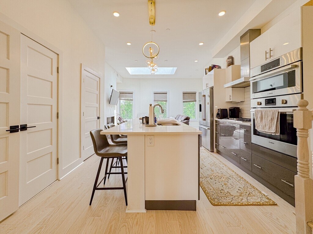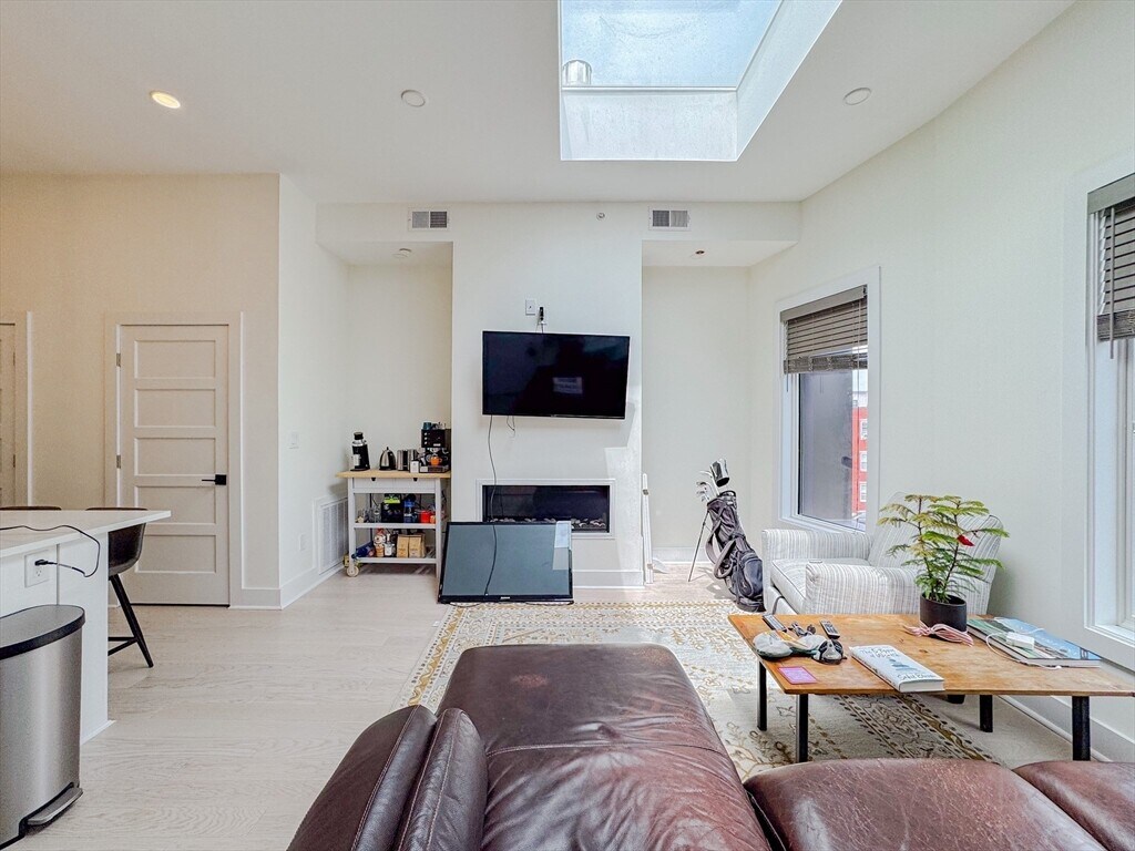 This stunning high-end penthouse was built in 2021, in East Boston’s sought-after Jeffries Point. This top-floor unit features 11’ ceilings, a dramatic 8’ skylight, and a spacious open-concept layout with central air, gas fireplace, and designer finishes throughout. Enjoy a chef’s kitchen with quartz waterfall island and premium Bosch appliances.Three bedrooms and two bathrooms, including a primary suite with double vanity, glass-enclosed tiled shower, and walk-out balcony. Step outside to your private 235 sq ft roof deck with jaw-dropping panoramic views of the Boston skyline and the water surrounding. The outdoor furniture and grill are included, perfect for entertaining. Covered parking included. Cats welcome.Prime location: Just blocks from Piers Park, the waterfront, and Harborwalk trails. Quick access to the Maverick T station (Blue Line), East Boston Greenway, local coffee shops, neighborhood favorites like Cunard Tavern and The Quiet Few, and the Seaport via water taxi.