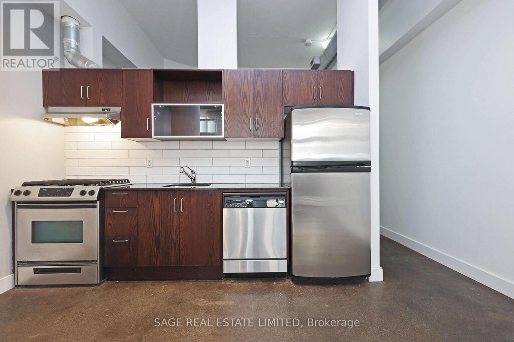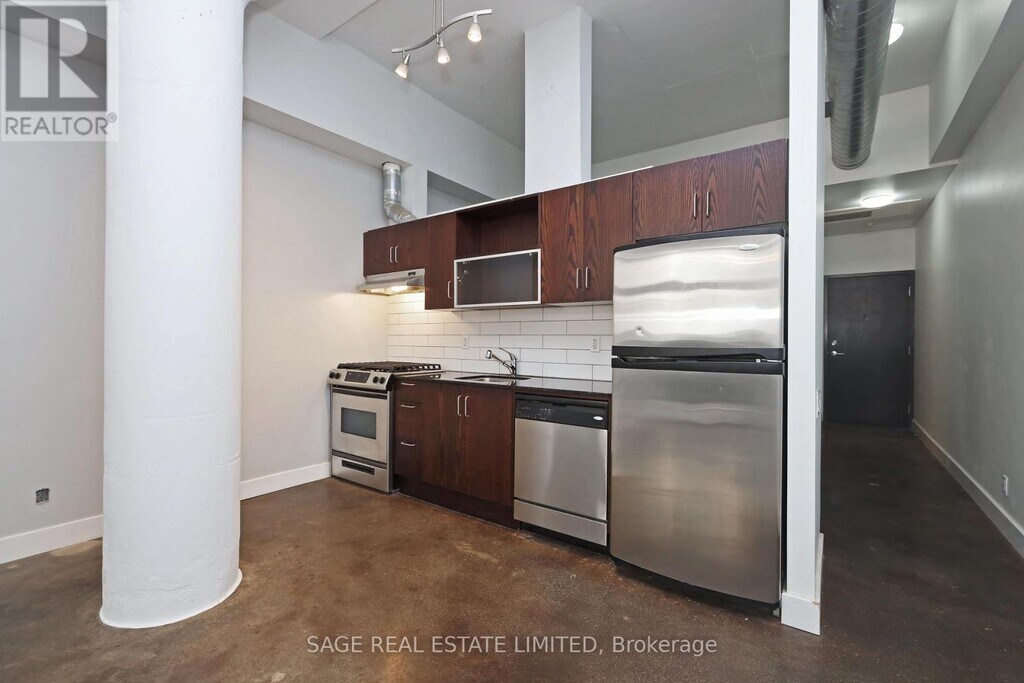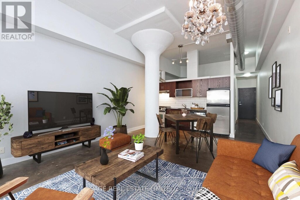 Located in the highly desirable Garment Factory Lofts,theres a lot to like about this bright and spacious one bedroom loft. You will appreciate almost 600 square feet of living space that features polished concrete floors and soaring 11 foot ceilings. Best of all is the spacious living/dining room that opens to an oversized,covered balcony that is a natural extension of the living space. The building features a concierge,gym and exercise room. Comfortably nestled in Leslieville,the convenient location features all the pleasures of city living. You are only steps away from charming streets,tree lined parks,and local shops,bars,restaurant and coffee shop. (id:52069) ID#: 1834217