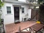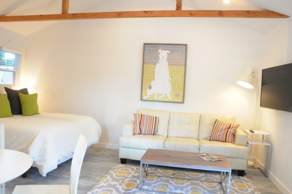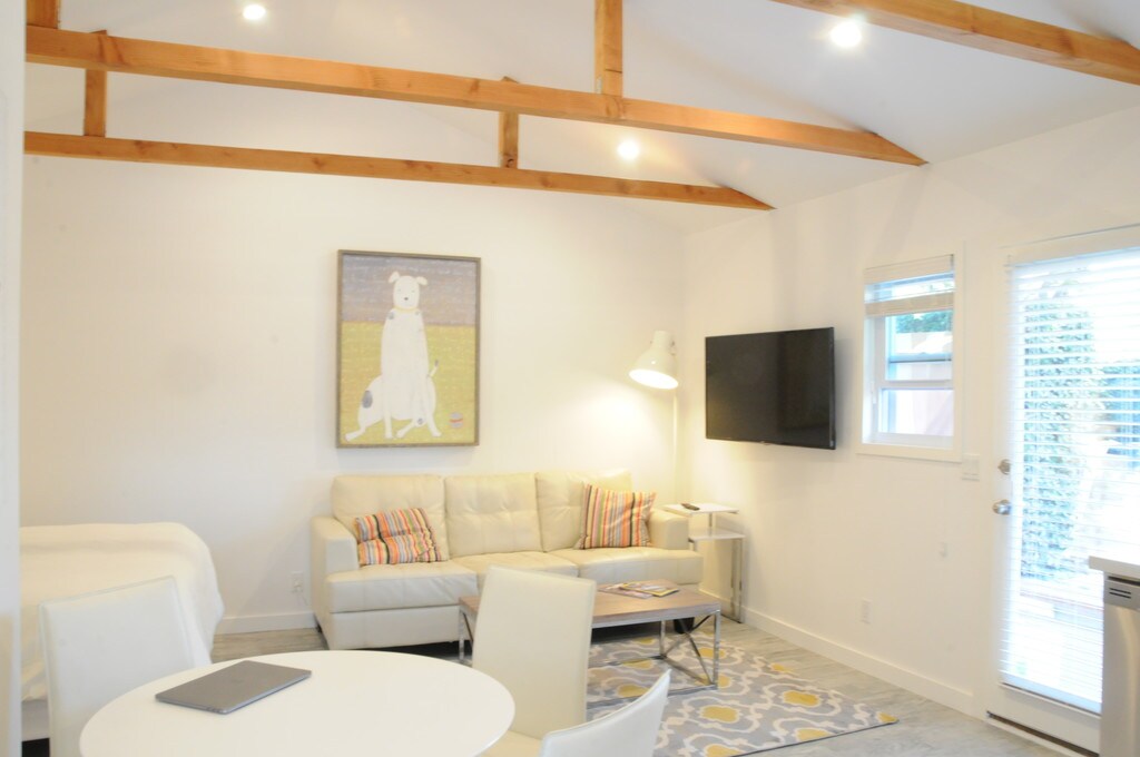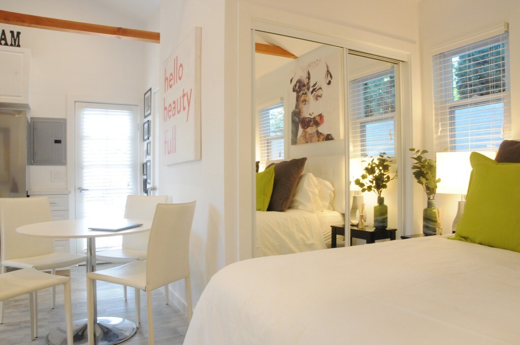 Furnished studio apartment. Patio, washer and dryer, dishwasher. Air Conditioning, and fully stocked with sheets towels and everything you need to make this your home. You will love this place. Parking is on the street, very easy with a permit that is provided. Patio furniture will be installed shortly.
