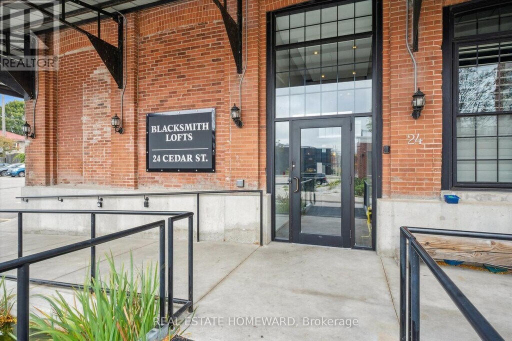 Welcome to 24 Cedar Street #303,a stunning 1-bedroom,1-bath true hard loft in one of Cambridge's most unique boutique buildings,home to just 27 units and a close-knit community of neighbours. Originally an 1880s blacksmith forge,this remarkable conversion blends heritage character with modern comfort in the heart of downtown Cambridge. Step inside and you'll immediately be captivated by the exposed brick and beam construction,soaring 14 ft ceilings,and original 140-year-old heavy wood flooring that tell the story of this building's industrial past. The open-concept living and kitchen area is bright and inviting,featuring stainless-steel appliances,ample cabinetry,and warm natural light that enhances every detail.The spacious bedroom includes a walk-in closet,while the 4-piece bath is modern and clean. Enjoy the convenience of in-suite laundry and exclusive parking,plus the unbeatable lifestyle of being within walking distance to the Grand River trails,Gaslight District,local cafés,and restaurants.This is more than a condo,it's a piece of Cambridge's history,lovingly preserved for those who appreciate character,community,and craftsmanship. And be sure to check out the rooftop patio while you're there! (id:52069) ID#: 1468078