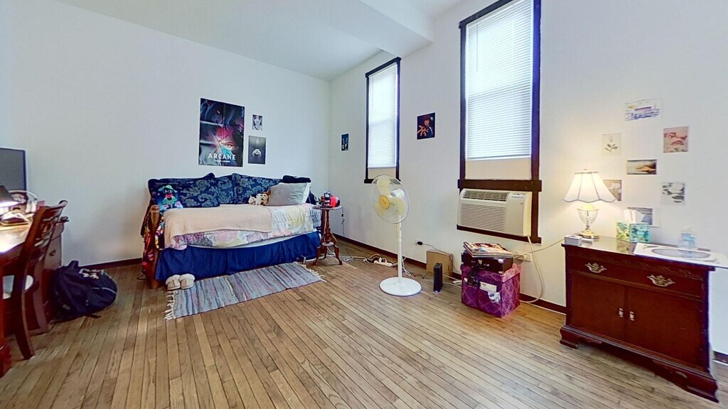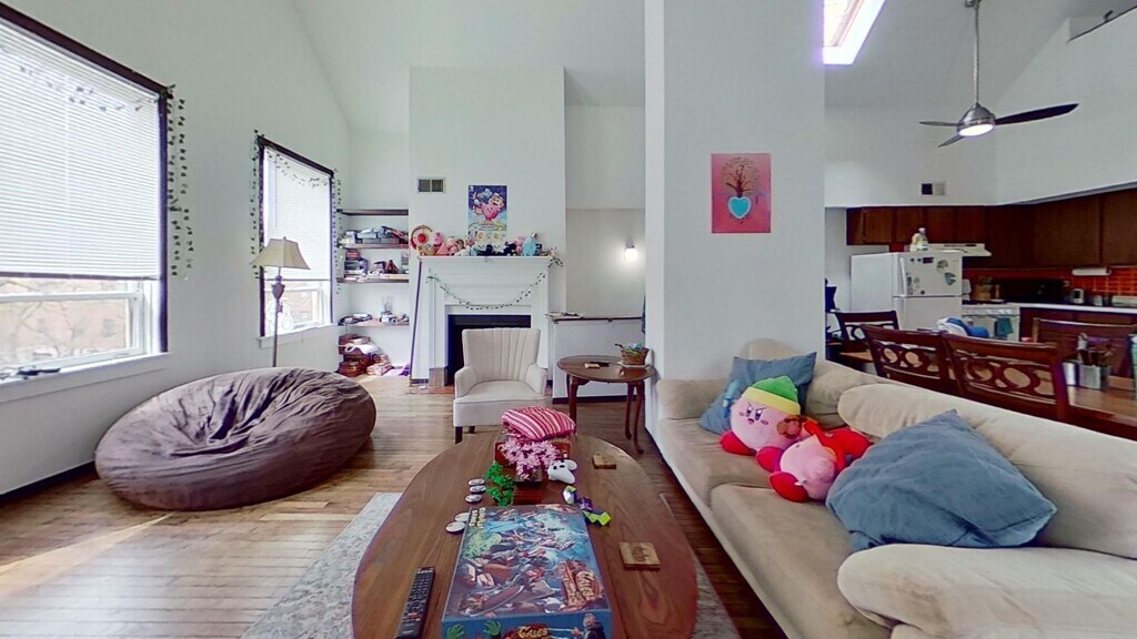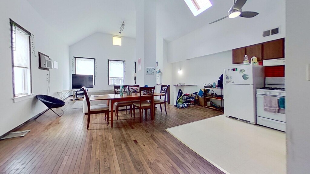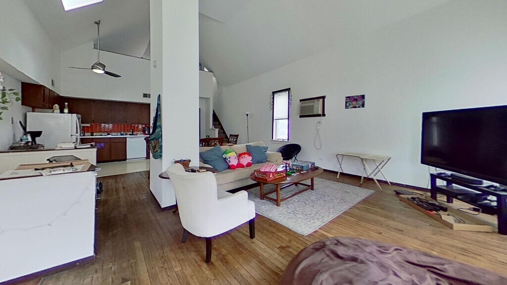 This top floor duplexed DePaul three bedroom features hardwood floors on the main level, carpet on the upper level, dishwasher kitchen with breakfast bar, gas-forced air heat, and air conditioning.