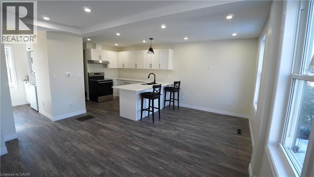 This meticulously newly renovated semi-detached residence is ideally situated in the vibrant downtown neighborhood of Corktown,with parks and trails directly across the street. Enjoy a prime location with convenient access to the GO station,recreational trails,parks,healthcare facilities,retail outlets,and some of Hamilton's premier dining establishments. Upon entry,you are greeted by a spacious open-concept design that seamlessly integrates living and dining areas. The refined kitchen boasts a peninsula-style island with a breakfast bar,stone countertops,and a dishwasher,with plenty of cupboard and counter space all complemented by abundant natural light from large windows that enhance the expansive living area. The first level also features a well-appointed four-piece bathroom with a tub and shower,and offers direct access to a private backyard—an ideal setting for outdoor living and entertaining during the warmer months. Additional amenities include a dedicated laundry area with an in-suite washer and dryer,complemented by ample storage space. A staircase with wood and wrought iron spindles leads to a versatile loft bedroom that can easily accommodate a home office or workspace. The residence is finished with luxury laminate flooring and contemporary fixtures throughout,and includes parking for two vehicles. This home represents a sophisticated urban living experience and is a residence you will be proud to call your own. (id:63800) ID#: 2193452