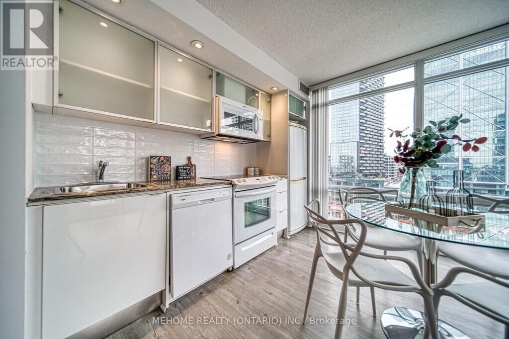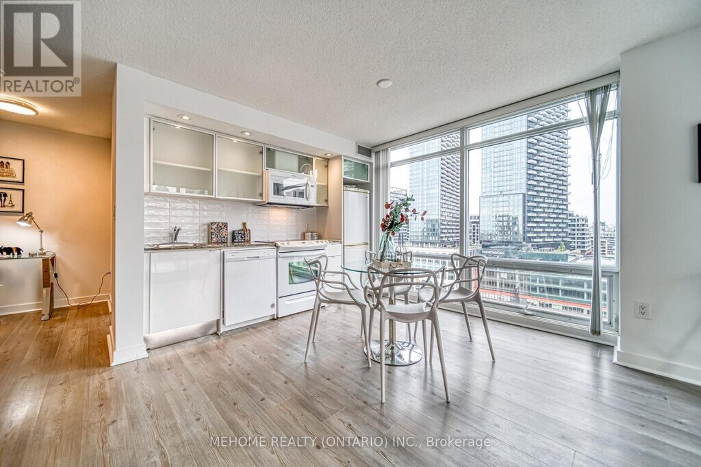 Montage at CityPlace! Enjoy a spectacular 270 view of the city from this bright and spacious 933 sq. ft. corner suite with a full-size balcony! Floor-to-ceiling windows fill the unit with natural light,while the functional split-bedroom layout and open-concept living area create the perfect space for both relaxation and entertaining.Featuring 2 bedrooms,2 bathrooms,and a versatile open-concept den/study,this thoughtfully designed layout is ideal for comfortable living and working from home. The primary bedroom offers a double closet and 4-piece ensuite,while the second bedroom boasts floor-to-ceiling windows and a double closet overlooking the balcony. Enjoy the convenience of ensuite laundry with a full-size stacked washer and dryer,A stylish new kitchen backsplash,and updated appliances including a microwave with range hood (2023),dishwasher (2023),and fridge (2025). Luxury building with resort-style amenities including an indoor pool,hot tub,gym,theater,outdoor lounge,BBQ area,guest suites,and more. Direct underground access to Sobeys Market for everyday convenience.Steps to Harbourfront,CN Tower,Rogers Centre,The Well,transit,restaurants,and shops. Includes 1 parking space and 1 locker. (id:52069) ID#: 2058676