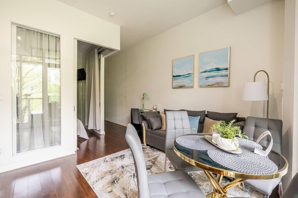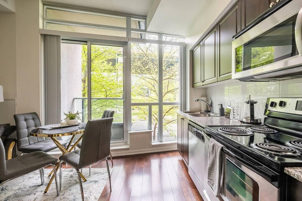 Welcome to this amazing apartment located in a boutique building in the heart of trendy Downtown Toronto. This 1-bedroom unit is perfect for singles, couples, or working professionals. The apartment is located steps away from Toronto's best restaurants, shops, and entertainment. This bright unit has floor-to-ceiling windows, an open concept layout, and high-end furniture chosen by an award-winning interior designer. This comfortable suite has everything you need to make you feel right at home. It includes 1 bedroom with 1 bathroom, a fully functional kitchen with supplies such as tea, coffee, a kettle, coffeemaker, and toaster. There is also a washer and dryer with supplies, and a bathroom equipped with towels, shampoo, conditioner, body wash, a hair dryer, and other toiletries you may have forgotten at home. Paid underground parking with in/out privileges is available upon request and is not included in the price. The price is $20 per night, and it should be requested in advance as it could be booked. Pets are allowed in the apartment with a fee of $20 per night for 1 pet, and confirmation is required prior to booking. A travel crib for babies 0-18 months and bed rails are available for $10 per item per night, and should be booked in advance. Guests must be 25 or over to check in. For reservations of 7 nights or more, check-in is possible from the age of 18. Guests whose names or ID do not match the information given are not allowed into the building. Smoking inside, damage to the unit, or violation of other house rules will result in the forfeiture of the deposit.