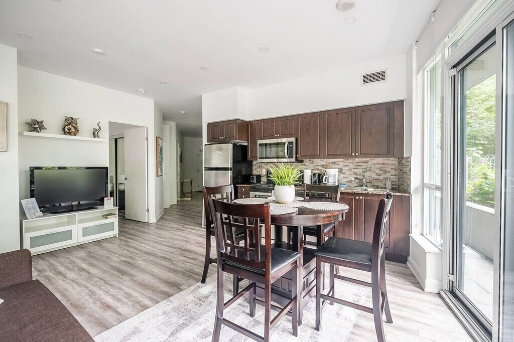 Welcome to this newly renovated 2-bedroom apartment located in a boutique building in the heart of trendy Downtown Toronto. Situated on the ground floor, this unit is perfect for families, big companies, or working professionals. The apartment is just steps away from Toronto's best restaurants, shops, and entertainment. This bright unit features floor-to-ceiling windows, an open concept layout, and two entrances: one private entrance directly from the street with a private terrace and the second from the building. This comfortable suite has everything you need to make you feel right at home. It includes 2 bedrooms with 1 bathroom, a fully functional kitchen with supplies such as tea, coffee, a kettle, coffeemaker, and toaster. Additionally, there is a washer and dryer with supplies, and a bathroom equipped with towels, shampoo, conditioner, body wash, a hair dryer, and other toiletries you may have forgotten at home. Paid underground parking with in/out privileges is available upon request and is not included in the price. The price is $20 per night or $10 CAD if you book 15 nights or more. Please request in advance as it could be booked. Pets are allowed in the apartment with a fee of $10 per night for one pet. If you plan to stay with pets, please confirm prior to booking. Travel crib for babies 0-18 months and bed rails are available at $5 per item per night. Please book in advance. Guests need to be 18 or over to check in. Guests whose names or ID do not match the information given are not allowed into the building. These are mandatory requirements, and if you do not agree to provide this information, a refund cannot be guaranteed. Smoking inside the unit is prohibited, and if it occurs, the deposit will not be refunded.