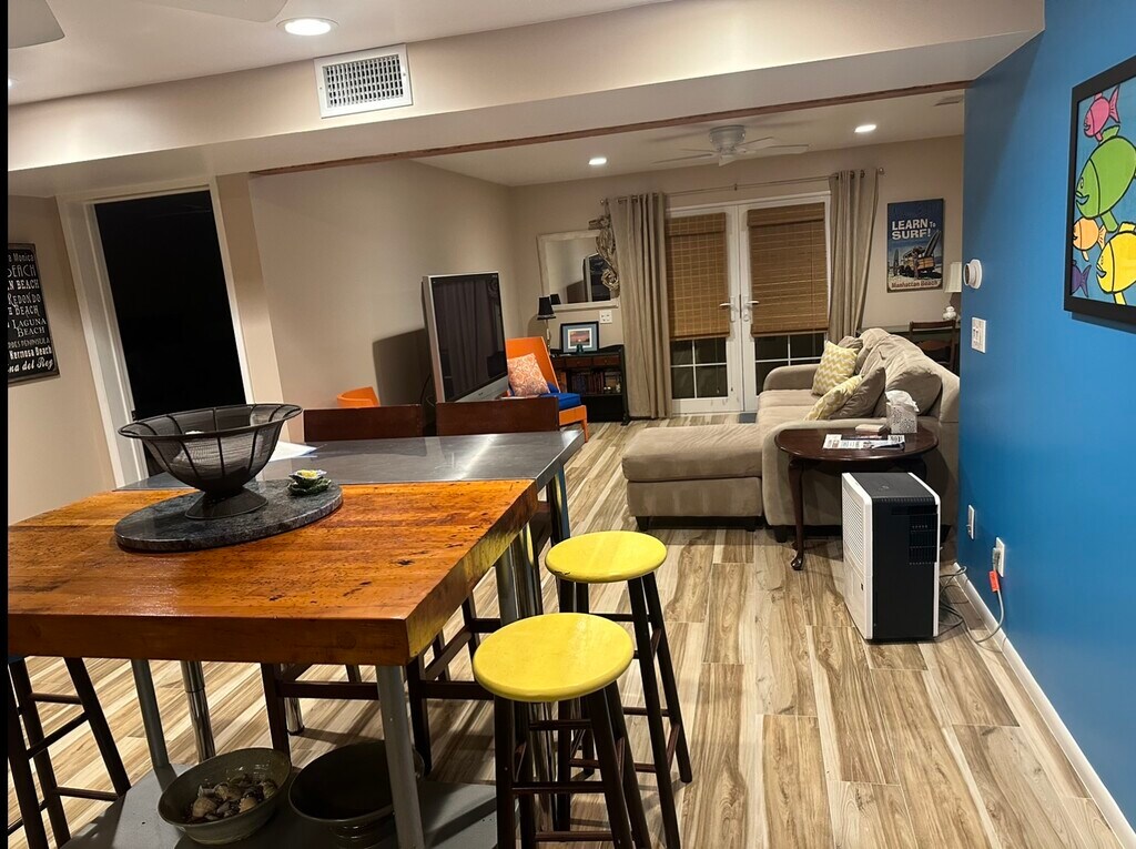 Large furnished one bedroom one bath in Manhattan Beach complete with a fully stocked kitchen, comfy linens, brand new flooring and a washer and dryer. walking distance to downtown, the green belt, and plenty of street parking. Also AC and plenty of free street parking. No pets please. Open for the month of February.