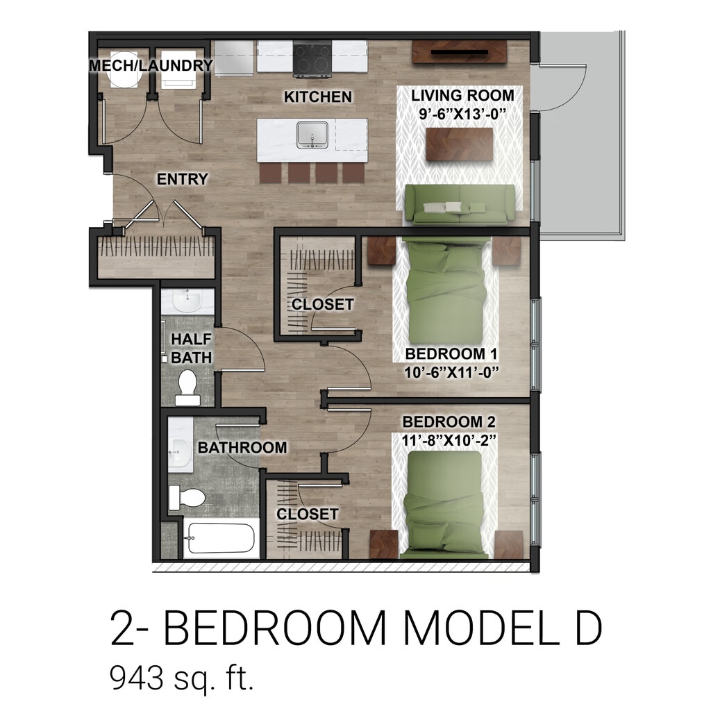 2 Beds, 1.5 Baths, 943 sq ftAvailable Aug 15, 2026Model Gallery