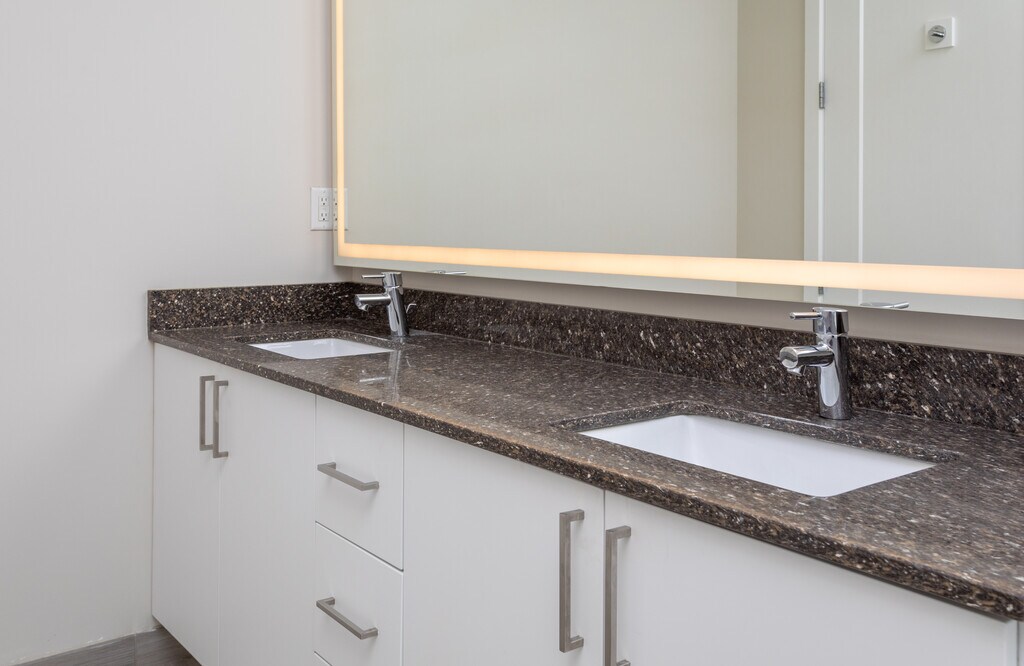 - Ceramic floors and backlit mirrors in bathrooms