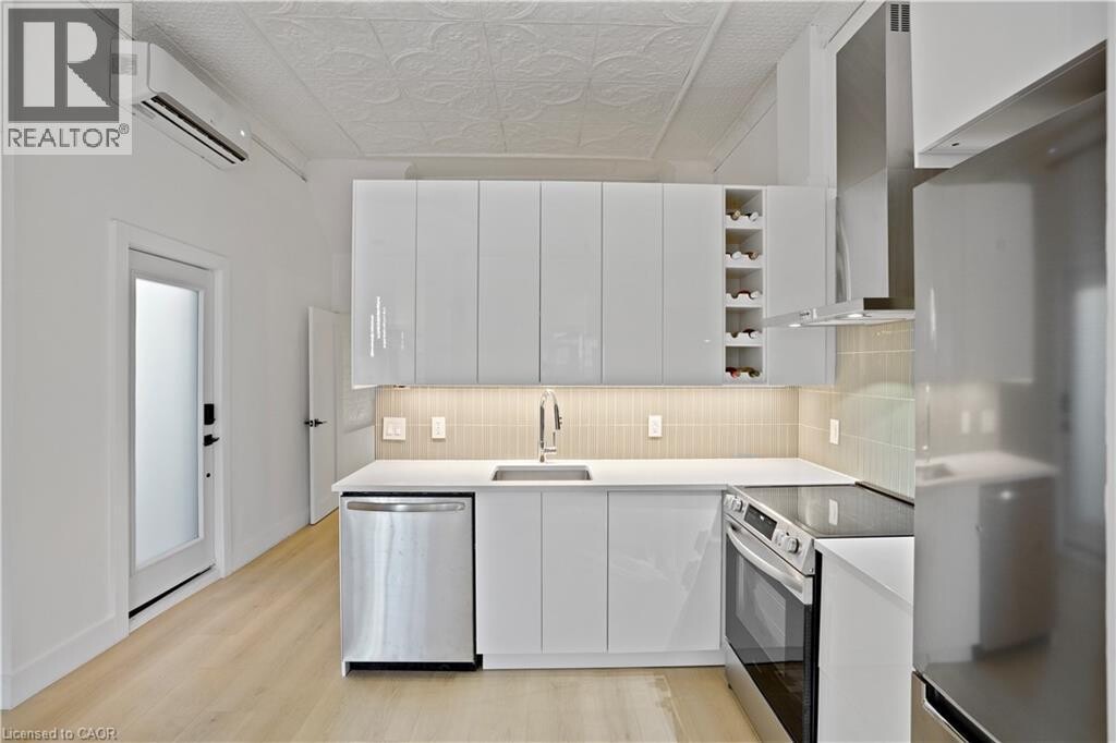 Introducing one of the most HIGH END LOFT experience in the history of WEST HAMILTON. Converted from a late 1800s building to the most modern residential living the City has to offer. Strategically located seconds to absolutely every amenity and highway access. Fully renovated from inside out,this loft unit features 11 foot ceilings,ceiling reclaimed from a century ago,mixed with modern import lighting from across the world,imported tile wall and backsplash tiles from floor to ceiling in both the bathroom and kitchen,white extended,soft close,custom lacquer cabinetry,under mount sink,custom stone counters and under mount counter lighting create a kitchen like no other. The home is completed with black-lit incredible mirror system,custom hardware and faucets,single panel doors,sealed custom trim,bevelled wide plank ultra modern flooring complete the loft space. The master bedroom includes 6ft windows,blackout blinds,and workspace nook. The lower level boasts exposed brick wall accents and is set up as a second bedroom. It can also make for the perfect office space,den or second living room. The unit is completed with parking,storage,brand new stackable LG high efficiency washer/dryer and ultra modern exterior refinishing including all new doors,windows,and future fully enclosed captivating terrace (rendering) perfect for Medical/Business/Legal professionals,single or couples. Call to view immediately! (id:52069) ID#: 1623259