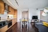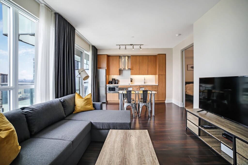 Welcome to 300 Front St W, a modern apartment located at the intersection of Front St and John St. This professionally managed unit offers a clean and contemporary living space with a fully equipped kitchen and in-unit laundry. Enjoy a restful sleep in the queen bed located in a separate bedroom with a walk-in closet. Step out onto the balcony for a beautiful view, and stay connected with the 50” Smart TV and high-speed fibre internet. A dedicated desk and chair are also provided for your convenience. With Starbucks and South St Burger located in the building, you'll have everything you need right at your doorstep. This apartment is furnished with comfortable pieces, and towels and linens are provided for your stay. Cleaning supplies, including a vacuum and mop, are also included to ensure a tidy living environment. Residents have access to all building amenities, including a state-of-the-art fitness centre and a seasonal outdoor pool. Situated just minutes from Toronto's top attractions, this apartment offers easy access to the CN Tower, Rogers Centre, shopping, entertainment, the financial district, public transportation, and dining options. Whether you're here for business or leisure, you'll find everything the city has to offer within reach. This apartment is managed by a trusted partner, ensuring a high standard of service and support throughout your stay. The apartment includes a dedicated desk and chair, perfect for those who need a remote work-friendly environment. A laptop computer is not included.
