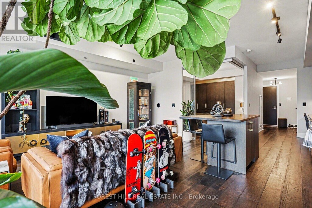 Bright and modern 1- bedroom & Den condo in one of Toronto's most desirable neighborhoods. Elegant hardwood floors flow throughout the open -concept living and dining area,enhance by floor-to-celling widows that fill the space with natural light and frame city view. The modern kitchen features stainless steel appliances and ample cabinet,perfect for cooking or entertaining. The versatile den can serve as a home office or creative space. Step out to your into your private balcony to enjoy fresh air and city vibe,includes one private underground parkin spot for added convenience. located steps from transit,shops,restaurant,and cultural amenities,this unit combines style,functionality,and the perfect balance of city living and personal comfort. Ready to move in and enjoy!Additional touches included in: select furniture and build -ins such as the TV console,office desk,Livingroom crouches,and coffee table,bedroom bed,mattress,and two night tables are included. The Fiddle leaf fig tree may remain to enhance. Its optional to remain and it will be decided between Landlord and Tennant. (id:52069) ID#: 2008052