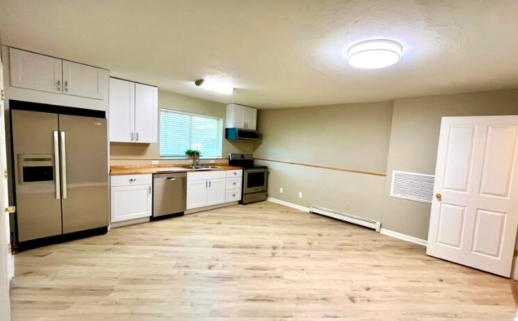 This large and light filled 2 bedroom, 1bath 1,200 sq ft home is freshly painted with new kitchen cabinets, butcher block countertops, dishwasher, garbage disposal and over the stove microwave. This garden level duplex, with full size above the ground windows, features a master bedroom with double closets and enough room to fit a king size bed. The home is situated in a quiet neighborhood that is conveniently close to Downtown Belgrade, Downtown Bozeman, and Bozeman Airport. It is just a few minutes walk to Saddle Peak Elementary School, Belgrade Middle School and Belgrade High School. This unit also features a full size washer/dryer, large storage room/pantry area, off street parking, baseboard radiant heat and a mini split AC. Call to see the property. Same day and evening appointments available. Sorry no pets, no smoking.