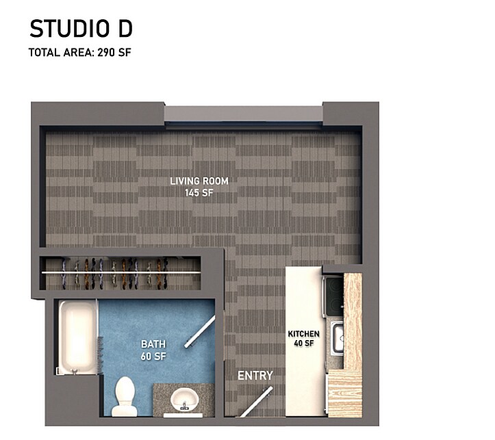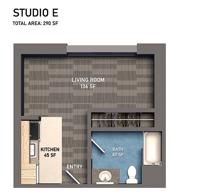 Studio A - Floorplan 1 Apartment Unit: PrivateApartment Model: Studio A$1,800Studio, 1 Bath, 231 sq ftAvailable NowStudio F