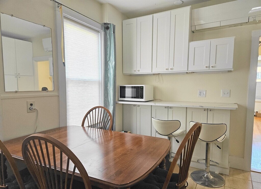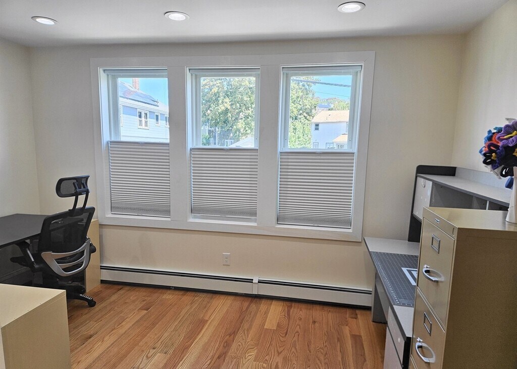 Well maintained 1 bedroom apartment on first floor of large two family house. Rent includes ELECTRIC, WATER and TWO parking spaces. Double pane insulated windows, hardwood floors throughout living room, bedroom and office areas. Kitchen has tile flooring, stone countertops, wood cabinets, stainless steel refrigerator, dishwasher and gas stove with vented hood. The large eat-in kitchen with plenty of cabinets presents a functional space to prepare meals with ease from simple breakfasts to elaborate dinners. Apartment has DUCTLESS MINI SPLITS for heating/cooling. Your own washer and dryer in the basement.