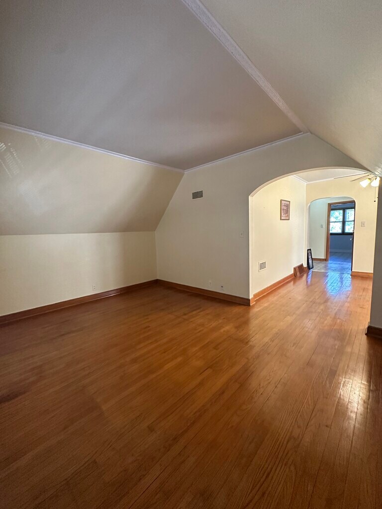 One bedroom, one bathroom upper unit with separate entry. Unit has hardwood floors, large bedroom, built in shelving, and included appliances! One car garage spot and 1 off street parking included. Fenced in yard and opportunity to garden. Basement has shared finished space and shared laundry. Building has forced air, central air. No smoking allowed. Dog friendly.