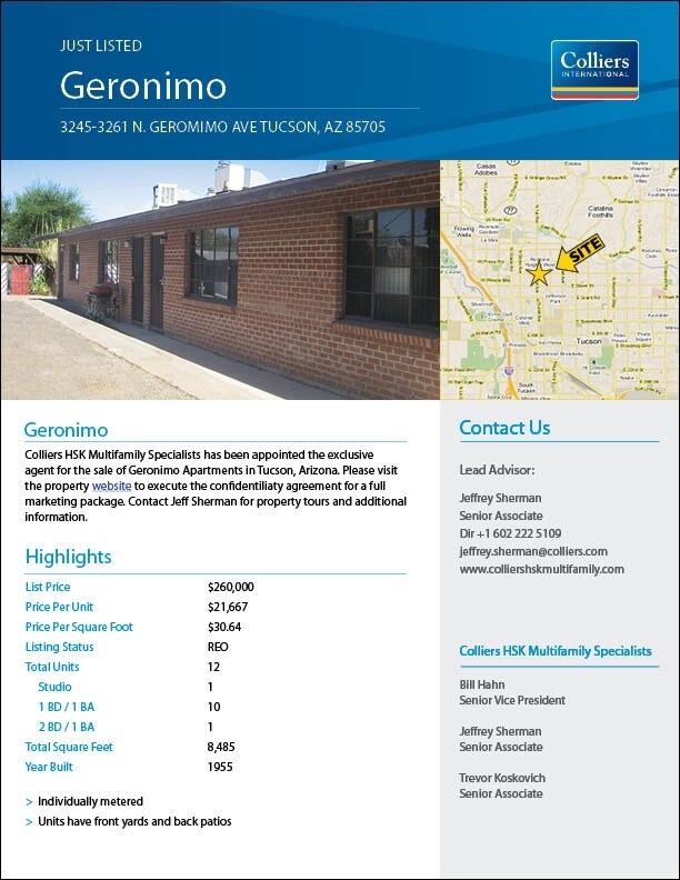 Thanks for your interest in 3245-3261 N Geronimo Ave in Tucson, AZ. Based in Tucson's Amphi neighborhood, living here offers a number of nearby attractions to enjoy. From pricing to features, the leasing staff is ready to help you find your perfect new place. Leasing 1 to 2 bedroom apartment floorplan options. Drop by the leasing office to find out the current pricing.