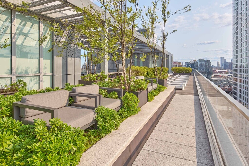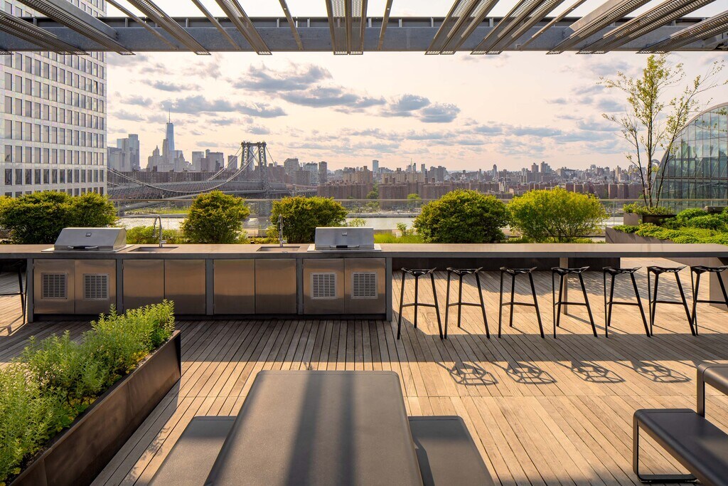 Designed by SHoP Architects and carefully constructed by Two Trees, the building’s unique profile enables it to maintain a distinguished street presence, while respecting the character of the surrounding neighborhood. The distinctive copper and zinc façade generates texture and depth, and the building’s shape gives the apartments luxurious amounts of light and air. The building also features expansive views of New York City’s breathtaking skyline. Every apartment layout is meticulously considered to maximize functionality with finishes and appliances that are of the highest quality and design. 325 Kent features enormous windows that provide apartments flooded with light. Custom-designed kitchens include stainless steel Bosch and Blomberg appliances. Each apartment also features a washer/dryer, hardwood floors, solar shades, and spacious custom closets. Additionally, many apartments include oversized private terraces or private balconies.