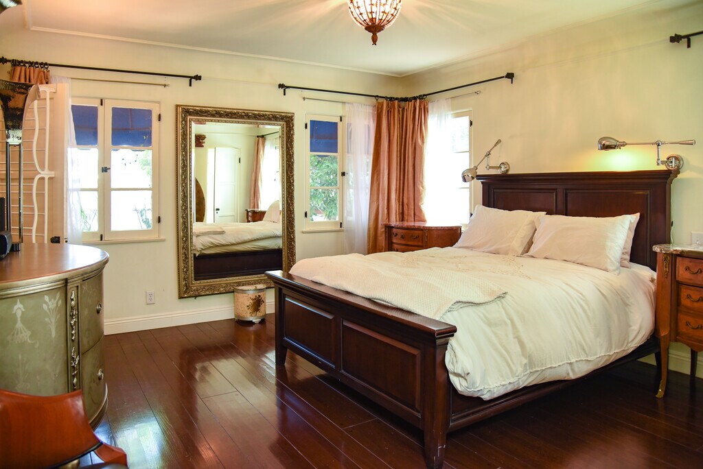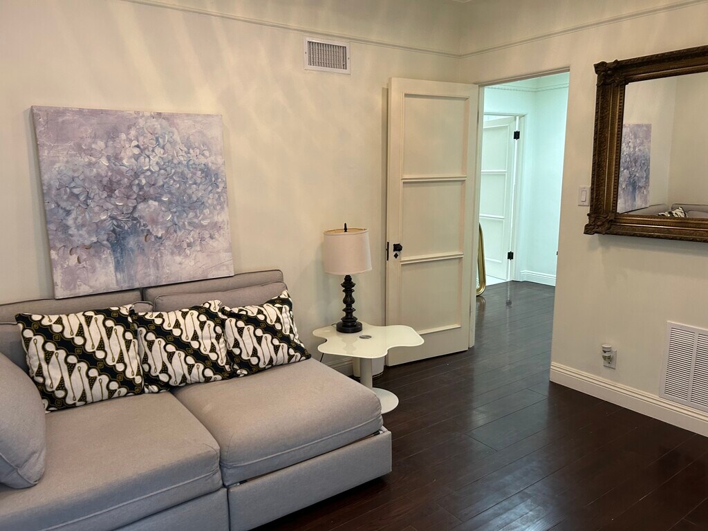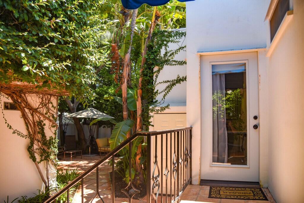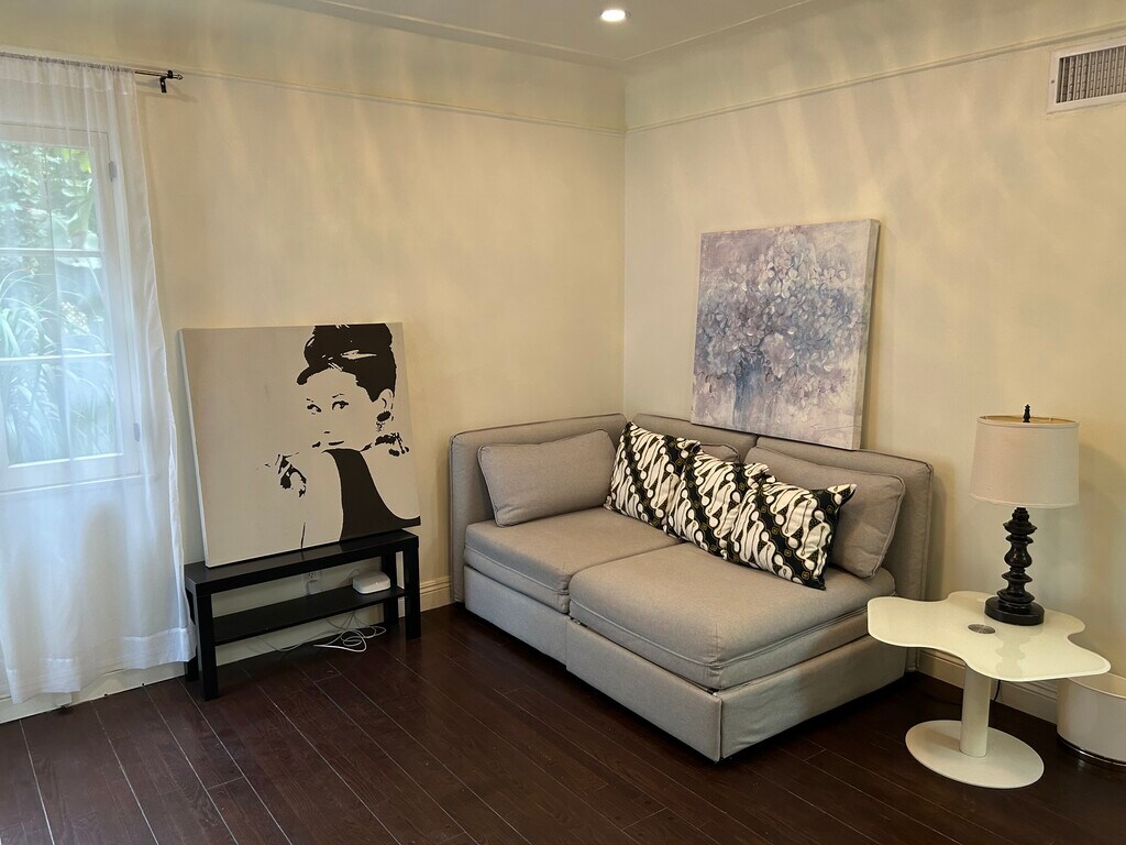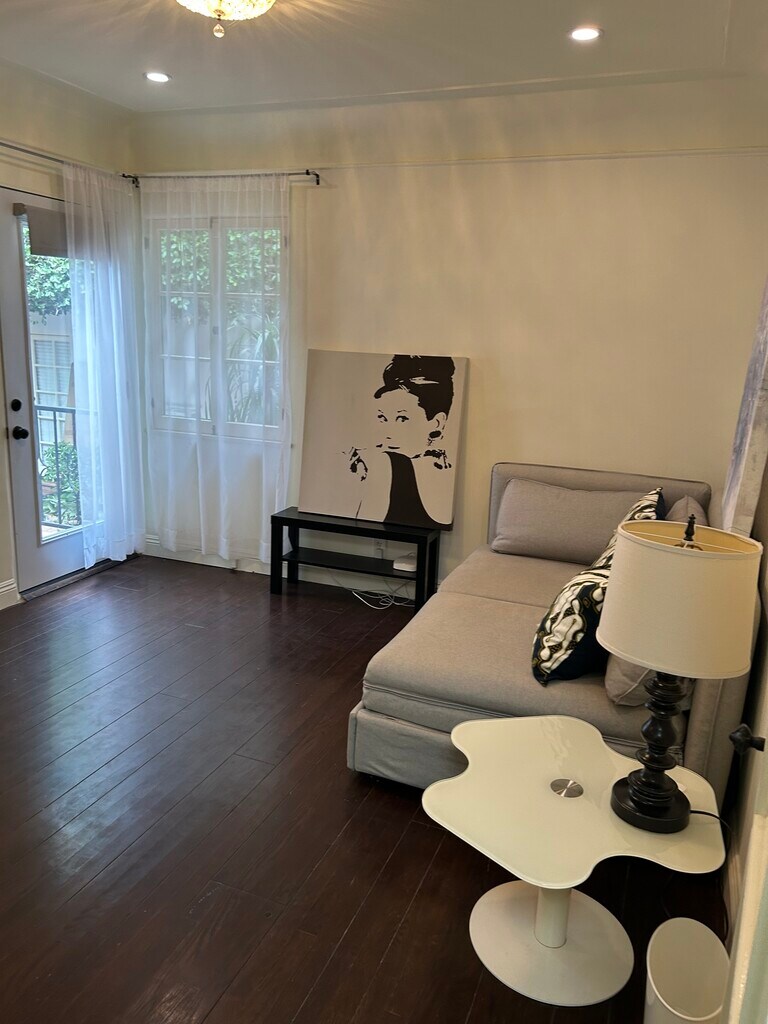 A luxurious, partially furnished Beverly Hills oasis. Secluded, Peaceful, Spanish, with old-world charm, hardwood floors, ample walk-in closet space, skylights, ground level off-street parking, central air conditioning, and verdant gardens. Shared laundry included on the premises. Private entrance into a private suite with a fabulous, very spacious bedroom having a high quality queen size bed, flat screen television, and framed floor to ceiling mirror. The bathroom features a large tub, large shower, Toto toilet beneath a glamorous skylit ceiling. The living room/den/office has ample closet space, bookshelves, sofa and flat screen television. Kitchen has skylight, two burner cooktop, microwave/convection oven, fridge, and pantry. The high walking score, close proximity to all that Beverly Hills has to offer: markets, cafes and shops makes this a very special home.