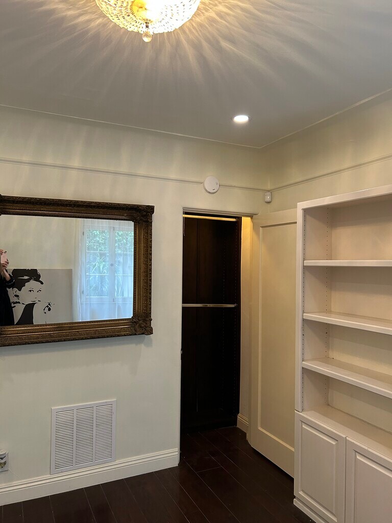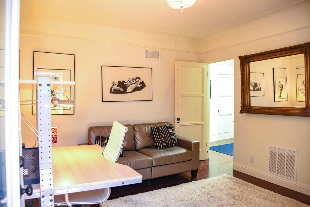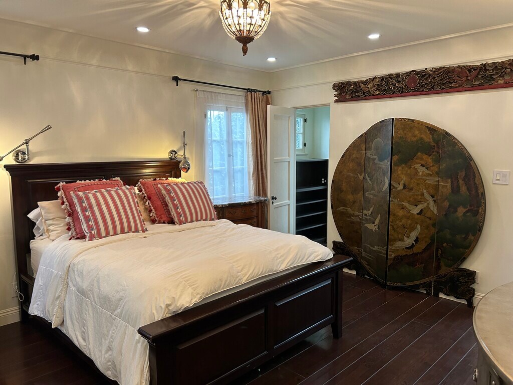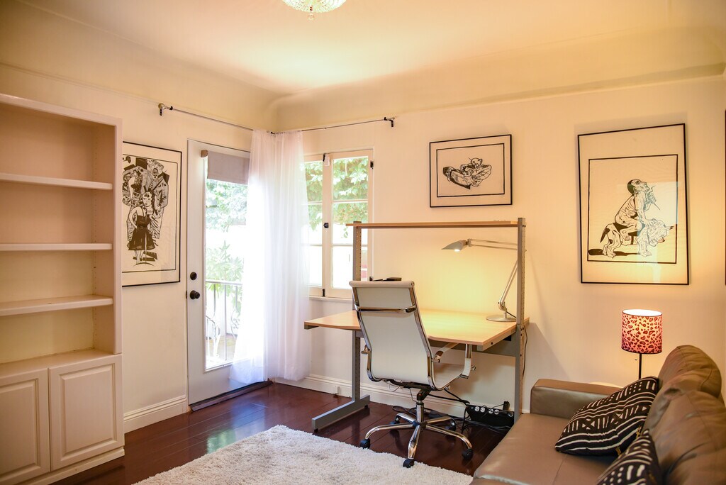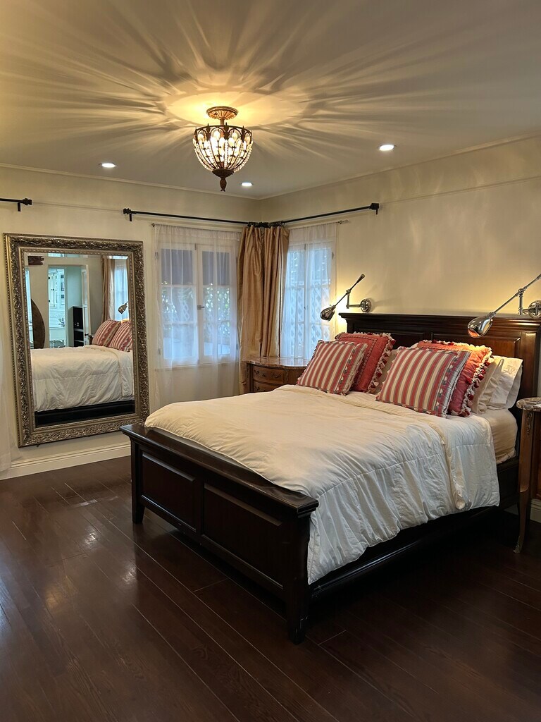 A luxurious, partially furnished Beverly Hills oasis. Secluded, Peaceful, Spanish, with old-world charm, hardwood floors, ample walk-in closet space, skylights, ground level off-street parking, central air conditioning, and verdant gardens. Shared laundry included on the premises. Private entrance into a private suite with a fabulous, very spacious bedroom having a high quality queen size bed, flat screen television, and framed floor to ceiling mirror. The bathroom features a large tub, large shower, Toto toilet beneath a glamorous skylit ceiling. The living room/den/office has ample closet space, bookshelves, sofa and flat screen television. Kitchen has skylight, two burner cooktop, microwave/convection oven, fridge, and pantry. The high walking score, close proximity to all that Beverly Hills has to offer: markets, cafes and shops makes this a very special home.