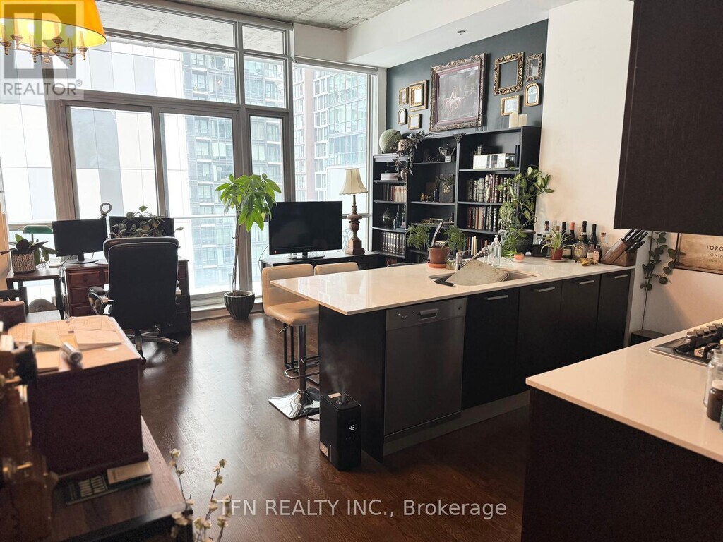 Fantastic building in the heart of Prime King West! This stylish 2-bedroom suite boasts soaring 11+ ft ceilings and over 700 sq. ft. of light-filled living space. Features include an open-concept living/dining area,smooth ceilings,hardwood floors throughout,and an upgraded Scavolini kitchen with gas cooktop and convection oven. Enjoy a huge balcony with a rare gas line for BBQs. The large ensuite laundry room offers excellent storage,and the primary bedroom includes a walk-in closet. TTC is right at your door in the centre of the vibrant Entertainment District. an unbeatable location. (id:52069) ID#: 2070395