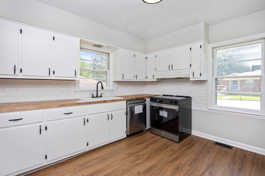 3 Bed, 2 Bath, 1,644 sq/ft of comfortable living space on a spacious 0.5 acre corner lot. Inside, you'll find fresh updates throughout, including a new roof, interior paint, lighting, bath fixtures, and flooring with original hardwoods plus new LVP in the kitchen, laundry, and primary bedroom. The kitchen has been refreshed with butcher block countertops, a subway tile backsplash, freshly painted cabinets with new hardware, and stainless steel Samsung appliances. Outside, enjoy the large corner lot with a wraparound driveway, a newly painted deck, a 3-car carport with an attached brick storage building, and an additional outbuilding for extra storage or hobbies. Conveniently located with plenty of space indoors and out, this home is move-in ready and waiting for its next tenants.