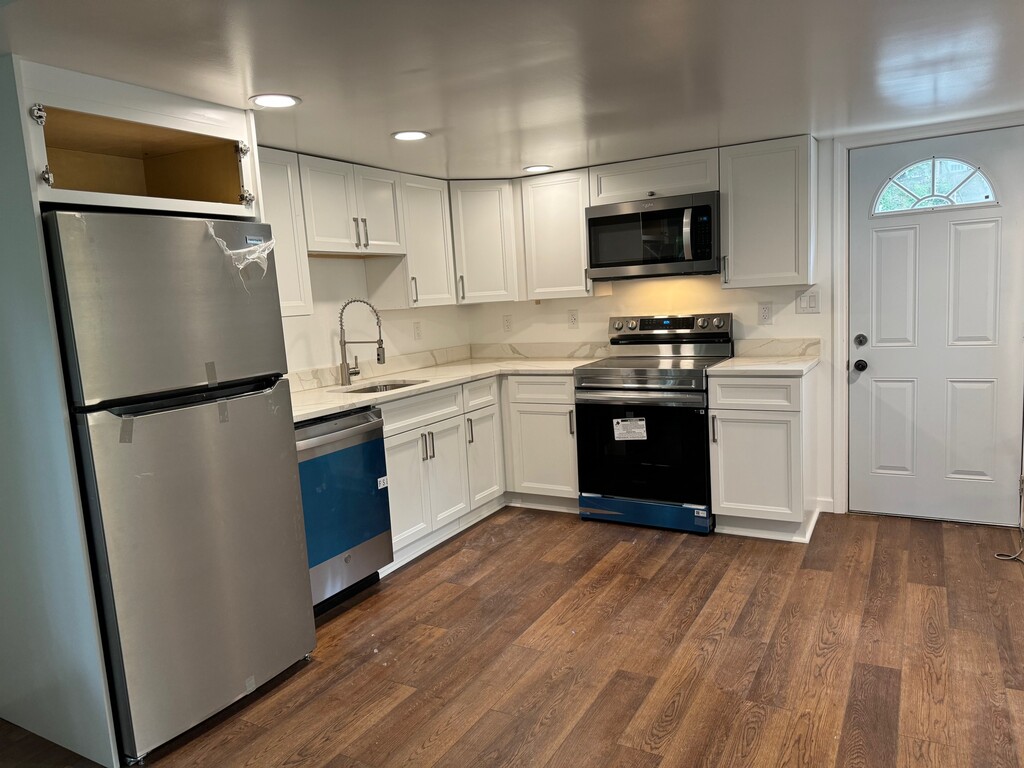 Fully renovated, spacious 4 bed, 1 bath single story, 1,200 sq ft apartment with a large living space, dining area, and patio. Enjoy brand new EVERYTHING in this fully remodeled apartment. The new kitchen is beautifully done with new cabinets, quartz countertops, undermount sink, and new stainless steel appliances, including a new dishwasher, refrigerator, hanging microwave, and electric oven. The new bathroom features brand new light fixtures, vanity, toilet, and shower. There is new luxury vinyl plank flooring installed throughout the kitchen, bathroom, and living room while brand new carpet is installed within the bedrooms. Enjoy doing your laundry with ease with a private, in-unit washer and dryer. The apartment and electric baseboard heaters are controlled via wall thermostats for tenants' convenience. Both the master bedroom and the common area have their own provided, in-wall remote-controlled, air conditioners for the tenant's immediate enjoyment. Pets considered on a case by case basis for an additional fee.