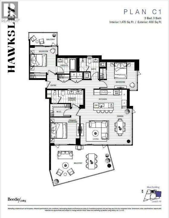 Rare opportunity! Located on the 4th level of Hawksley,this stunning Southeast-facing Corner 3-bed,3-bath home in West Vancouver features 1,470 sf of home space and a spacious 400 sf terrace facing south towards the water. Inside your home,enjoy engineered H/W flooring throughout,AC,expansive windows and ceilings up to 9´. The chef's kitchen features an integrated appliance package by Miele & Liebherr - great for honing your culinary skills. In the ensuite,receive a recessed medicine cabinet,double vanity,stainless steel niche in the shower and a large walk in closet. Throughout the building,Hawksley offers their residents a co-working & study space,restoration studio,workshop with repair stations,music studio and more. Hawksley is located mins from Mulgrave & CollingWood (id:52069) ID#: 2049573