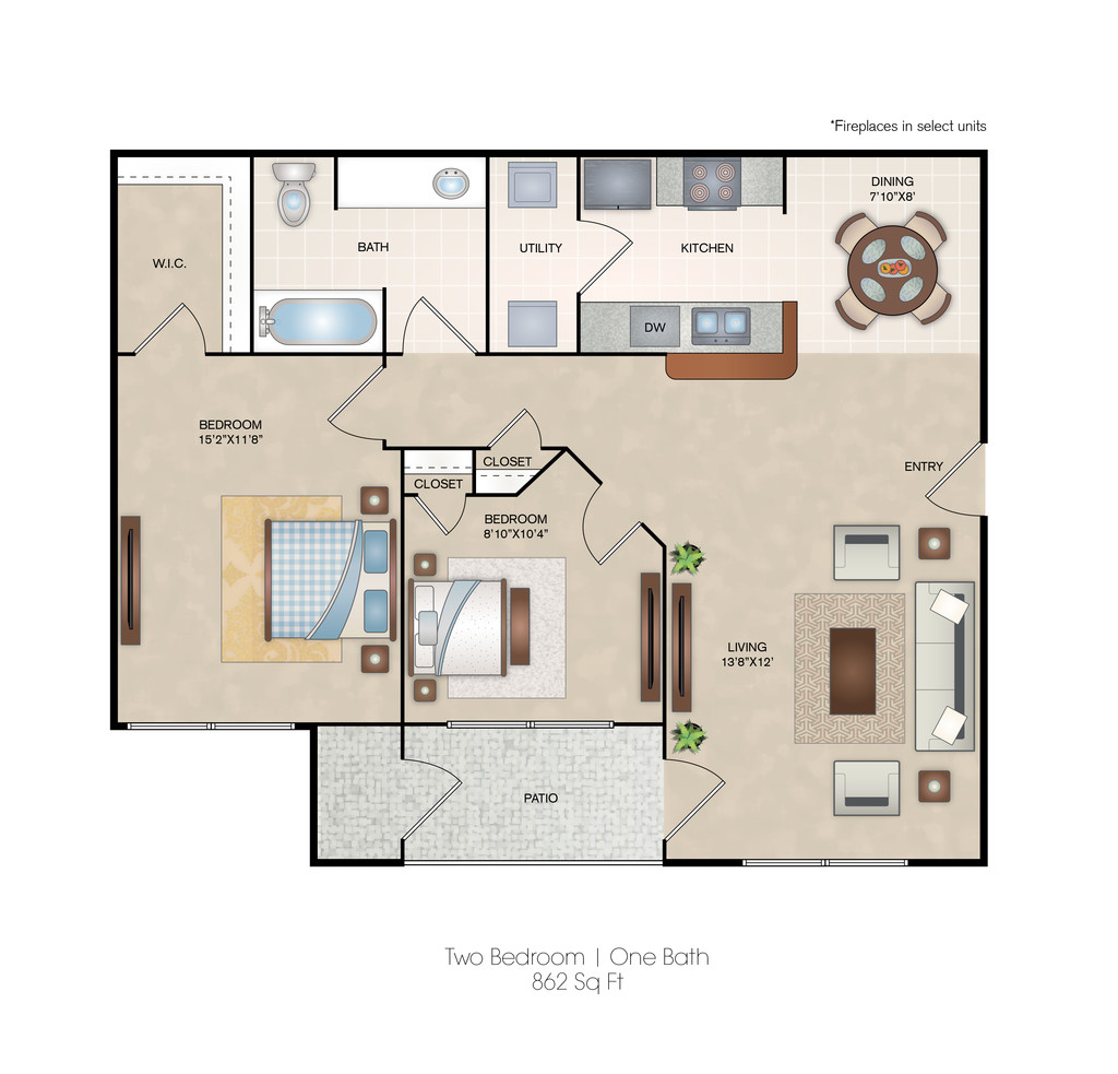 2 Beds, 1 Bath, 862 sq ftAvailable NowModel Gallery