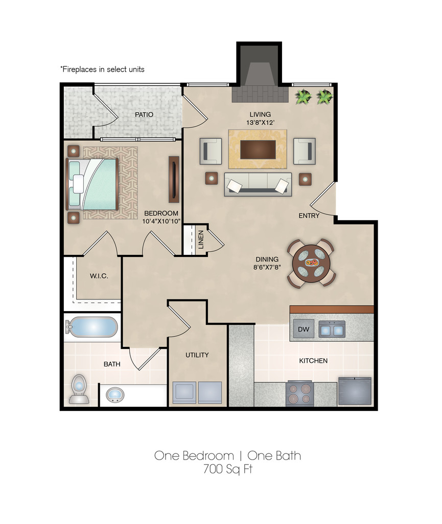 1 Bed, 1 Bath, 700 sq ftAvailable NowModel Gallery