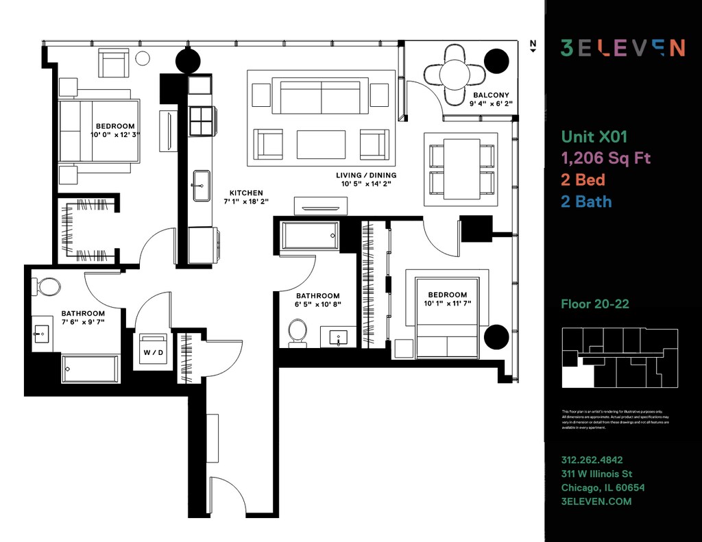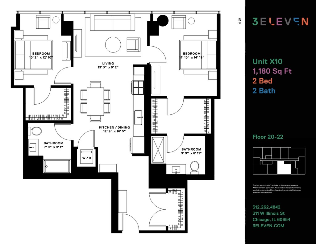 3Eleven is the ultimate destination for those seeking a vibrant lifestyle in the heart of River North. This stunning addition to the neighborhood offers thoughtfully designed open-concept living spaces that perfectly blend work and leisure. As you step into 3Eleven, you’ll find a variety of layouts from studios to three-bedroom apartments, each featuring sophisticated touches like floor-to-ceiling windows with solar shades and stylish laminate flooring. Our luxury apartments boast contemporary details, including custom closets, sleek quartz countertops, stainless steel Whirlpool appliances, and expansive balconies with breathtaking views in select units. At 3Eleven, we elevate your living experience with an array of exceptional amenities, including a state-of-the-art fitness center equipped with the latest technology and a dedicated yoga studio; a rooftop deck featuring fire pits, grills, and ample lounge seating for relaxation and socializing; co-working lounges complete with private study rooms for those who work from home; and a pet-friendly environment where your furry friends can enjoy a pet spa and a dog run. Located at the bustling intersection of Illinois St and Wells St in River North, 3Eleven places you in the heart of Chicago’s finest offerings. Enjoy easy access to trendy coffee shops, acclaimed restaurants, and vibrant entertainment venues—all just steps away. With nearby Brown and Blue CTA lines, exploring other neighborhoods around the Windy City is a breeze. Prices listed may reflect net effective rental rates and include concessions (free rent) and/or special offers. Lease terms, pricing, and availability are subject to change at any time. Ask the leasing team for more details.