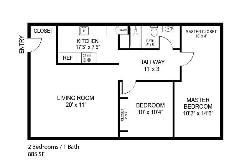 2 Beds, 1 Bath, 880 sq ftAvailable NowModel Gallery