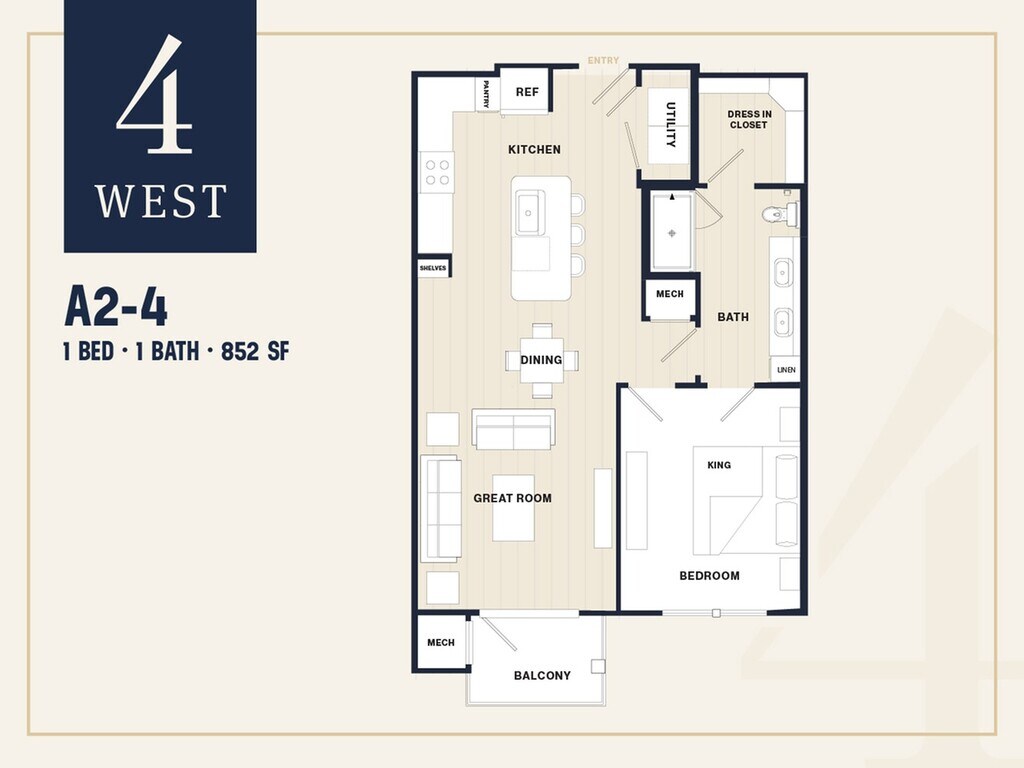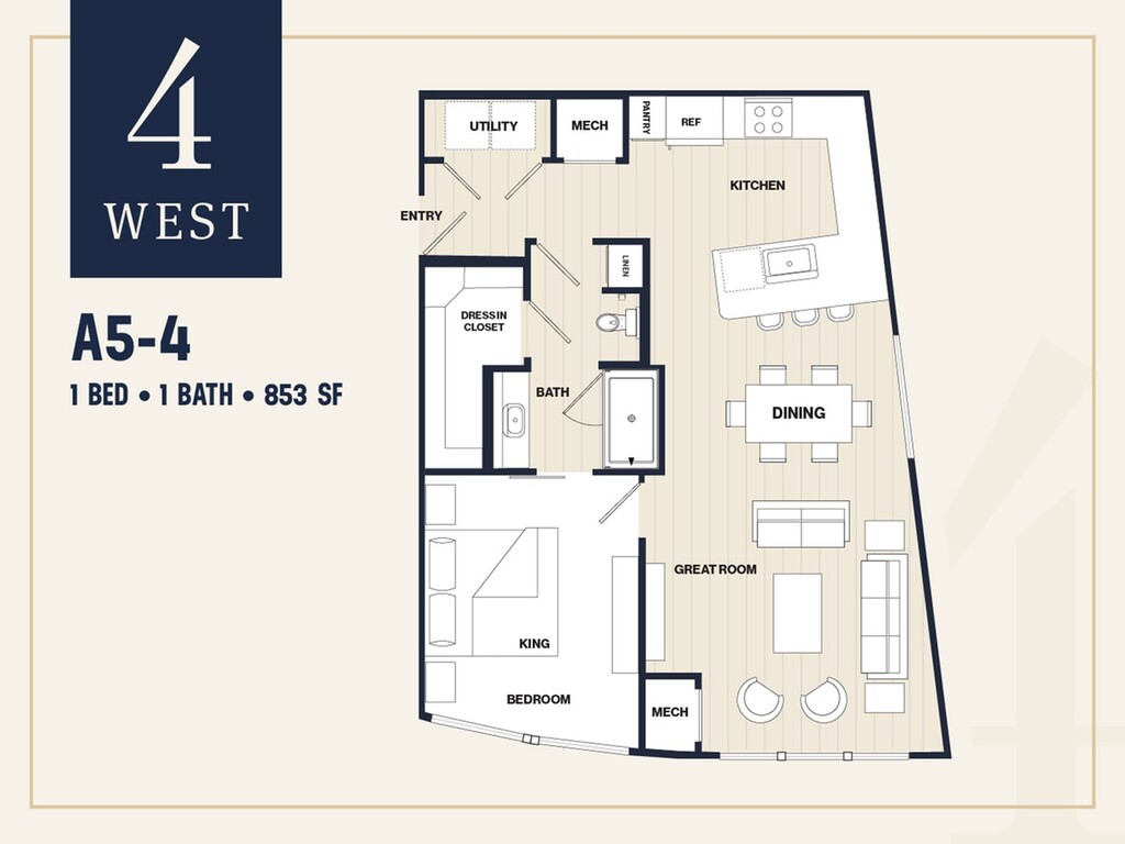 A5 - Floorplan 1 Apartment Unit: 4-4201Apartment Model: A5$1,8901 Bedroom, 1 Bath, 853 sq ftAvailable NowFloorplan B1H