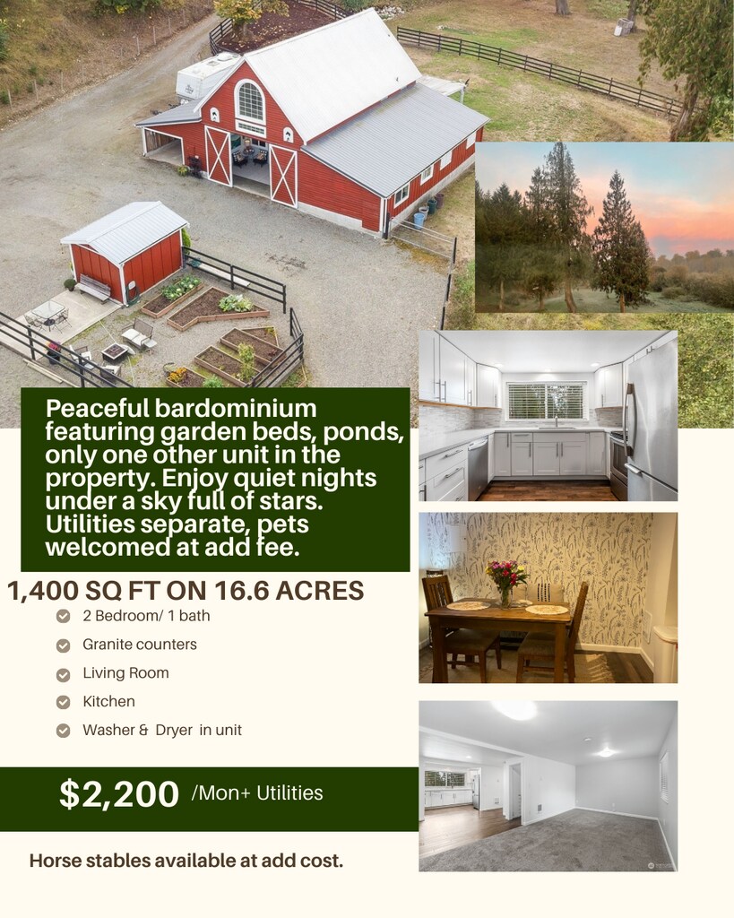 Peaceful barn, dominium featuring garden beds ponds only one other unit on the property enjoy quiet nights under the sky, full of stars, utilities separate some pets allowed at an additional fee.