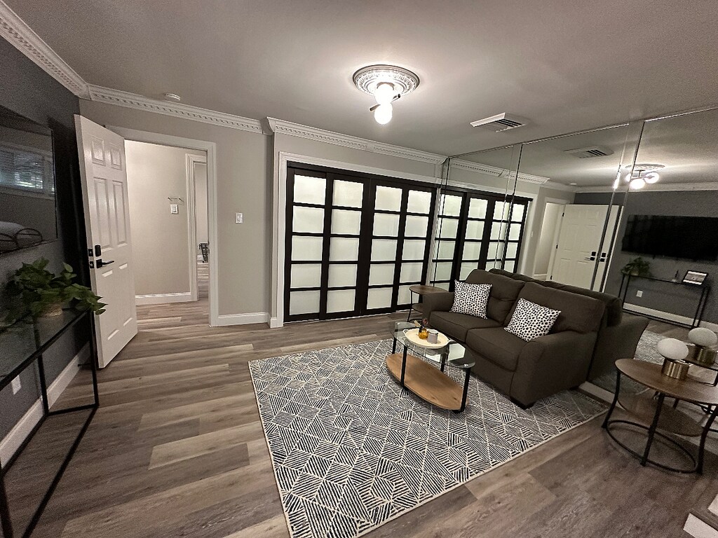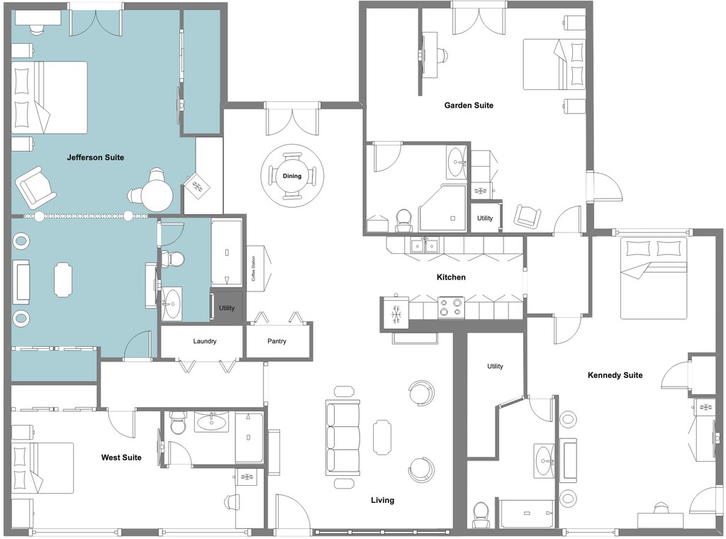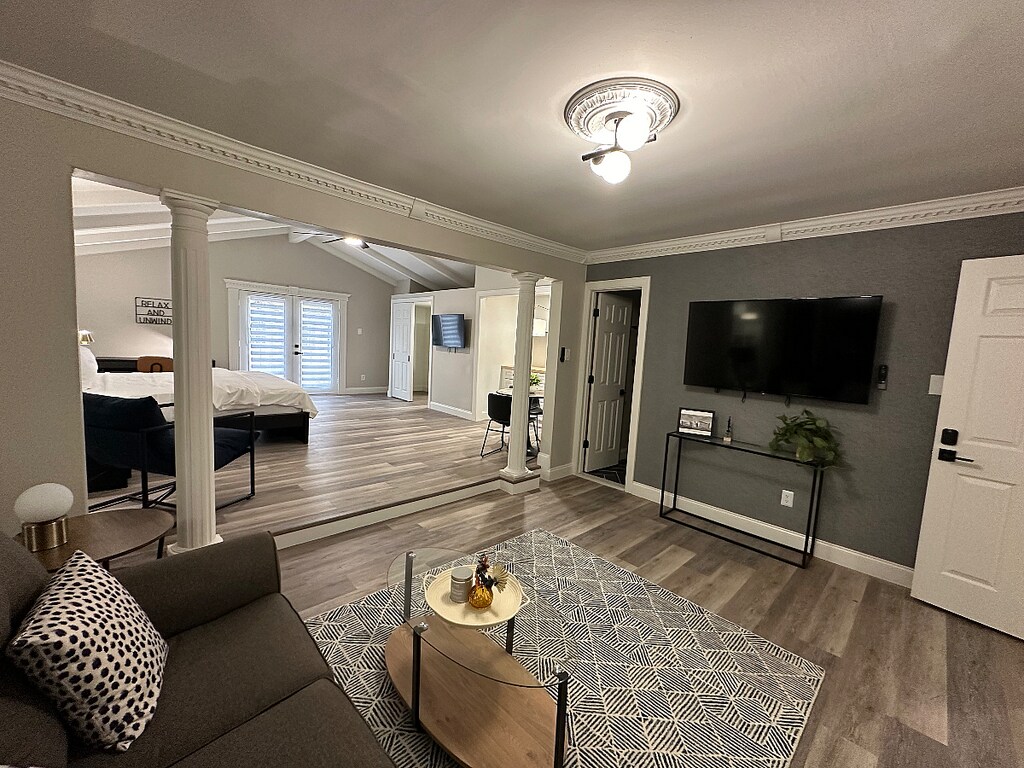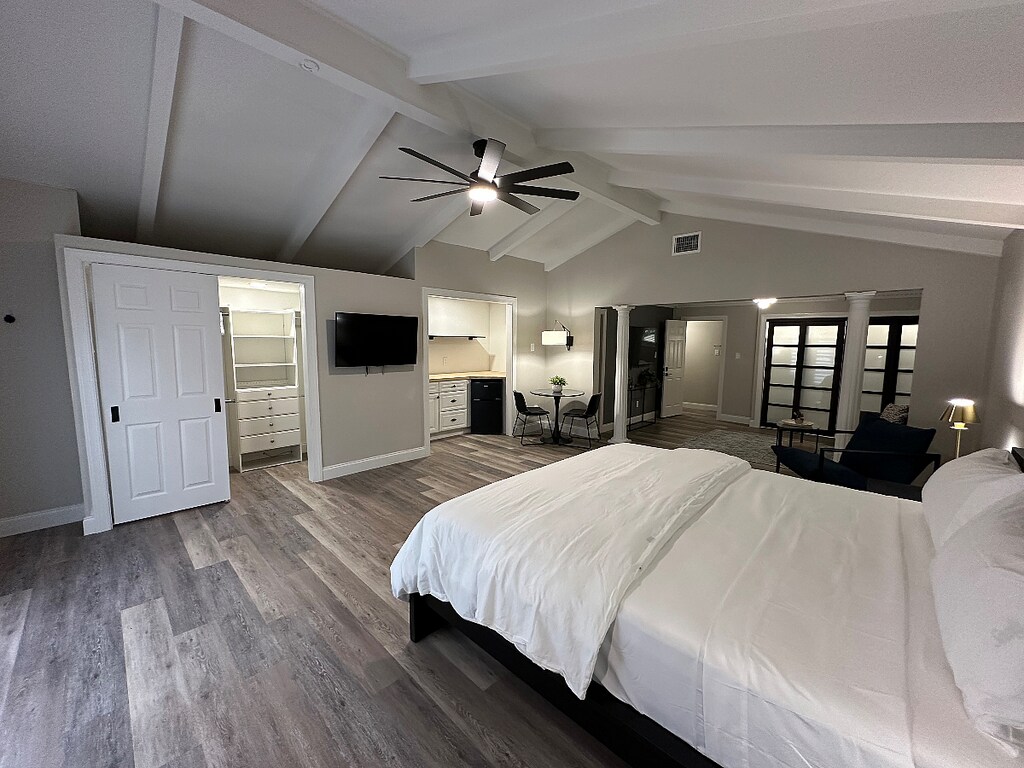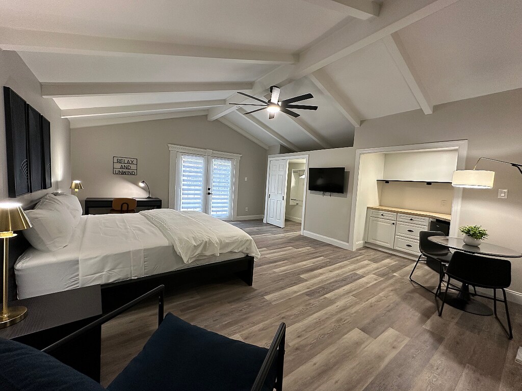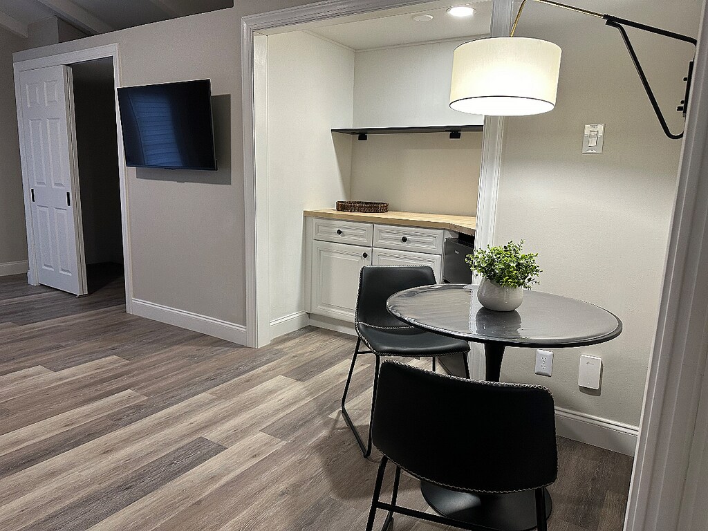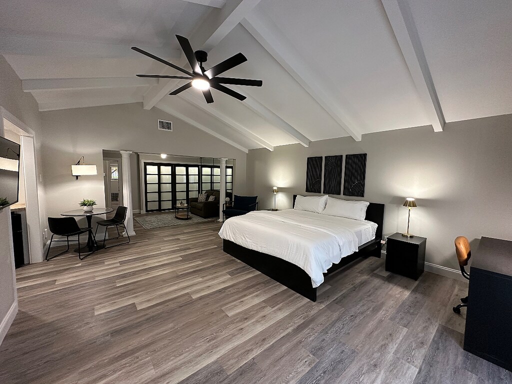 *THIS IS A SHARED PROPERTY - Common/shared areas include: Kitchen, dining room, main living room, and laundry closet. The Jefferson Suite includes a spacious bedroom with King bed, private living room, dinette for two, mini fridge and cabinet storage, en-suite bath, walk-in closet, additional closet for storage, workspace and two 55" Amazon Fire TVs. This unit has french doors with access to fenced in yard. Please note, this is a shared property and does not have an in-unit kitchen.