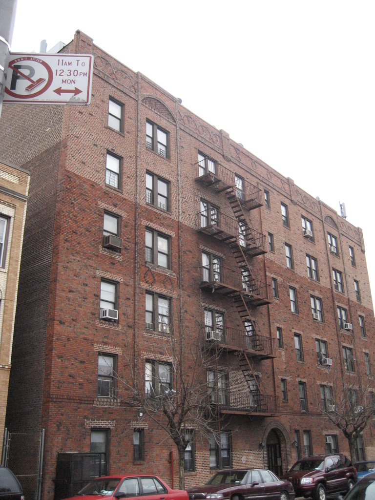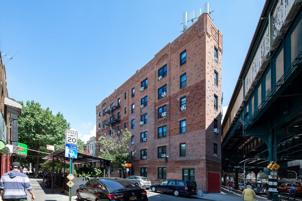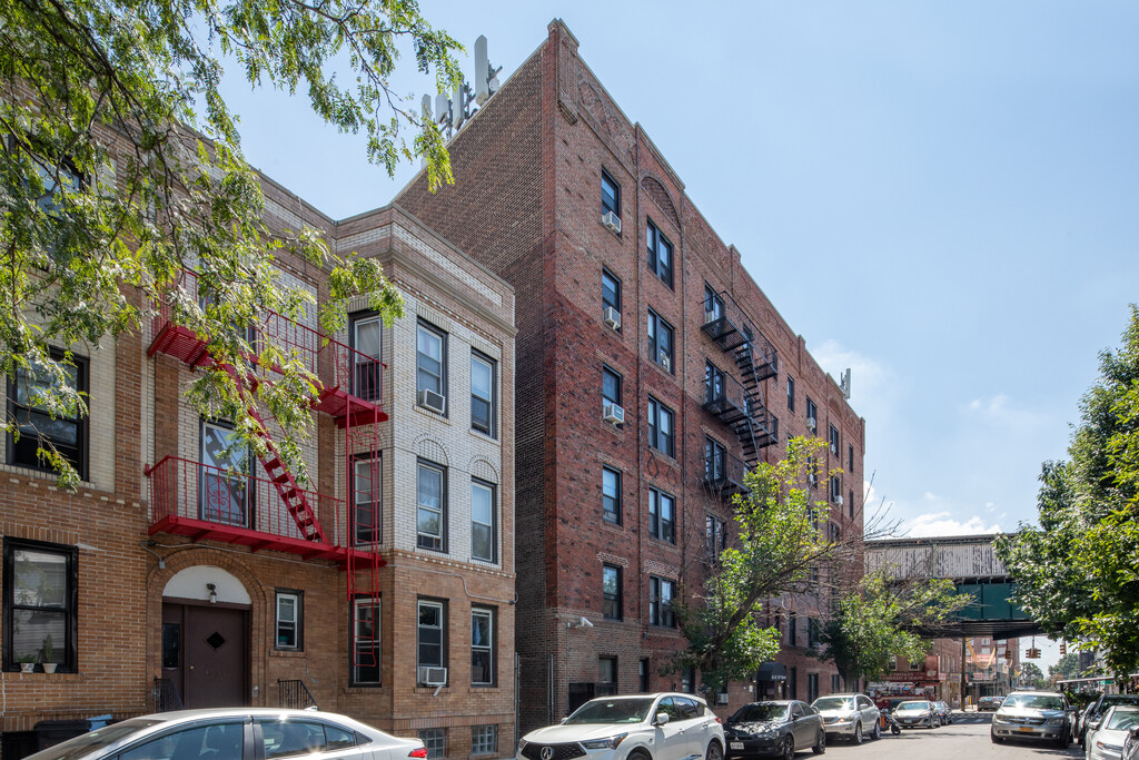With a unique triangular shape like the famous Flatiron Building, this 6-story prewar beauty features a red brick exterior with plenty of ornamental details. The elevator building has 47 apartment units. A subway line (7) is just steps away.